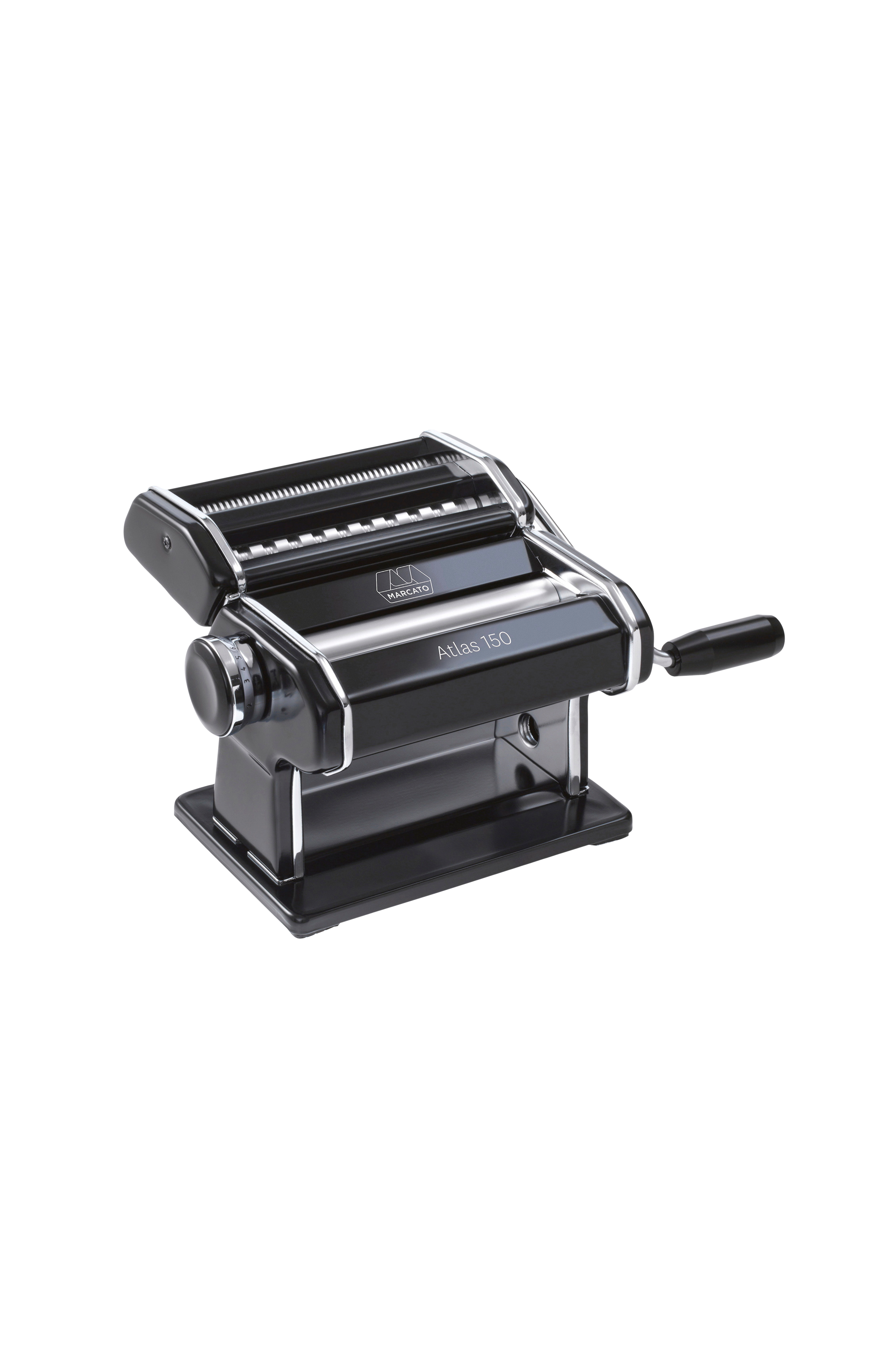 Marcato klassisk pastamaskin med justerbar lasagneplåtstjocklek, från 0,6 till 4,8 mm. Inkluderar rullar för fettuccine (6 mm) och tagliolini (1,5 mm). Max bredd för lasagneplattor är 15 cm, med en bordsklämma inkluderad.