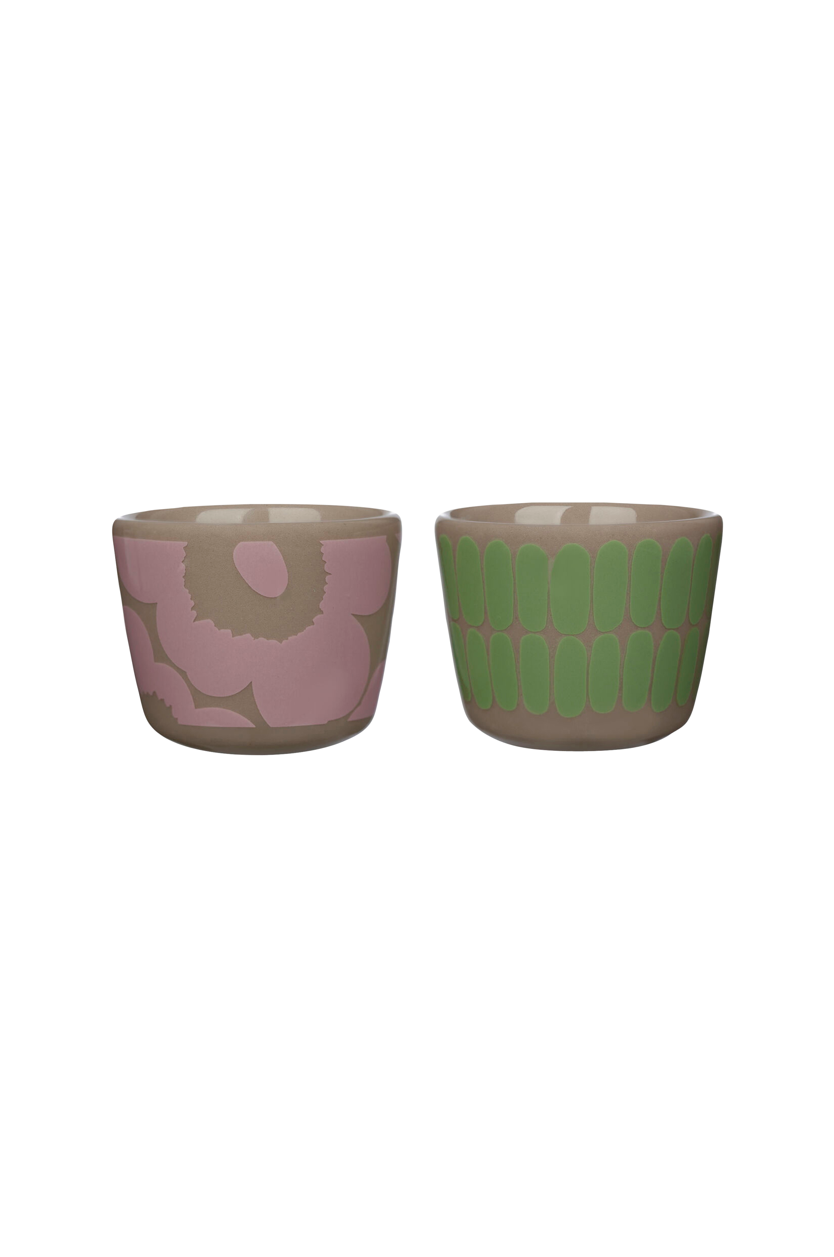 Dessa äggkoppar är gjorda av brunt stengods, som tål diskmaskin, ugn, mikrovågsugn och frys. Detta set innehåller två äggkoppar, en med Alku-mönstret och en med Unikko-mönstret. De bönliknande formerna i Alku (början) designen representerar frön som växer till magnifika, kraftfulla blommor. Marimekkos berömda vallmomönster Unikko föddes 1964 i en tid när designhusets kollektioner innehöll mest abstrakta tryck. Designern Maija Isola ville skapa något intressant utifrån detta ekologiska tema och designade en hel rad blommönster. Idag representerar den ikoniska blomman kreativitet. Ta bort klistermärket från produktens undersida före användning. Klistermärket innehåller en liten mängd metall.