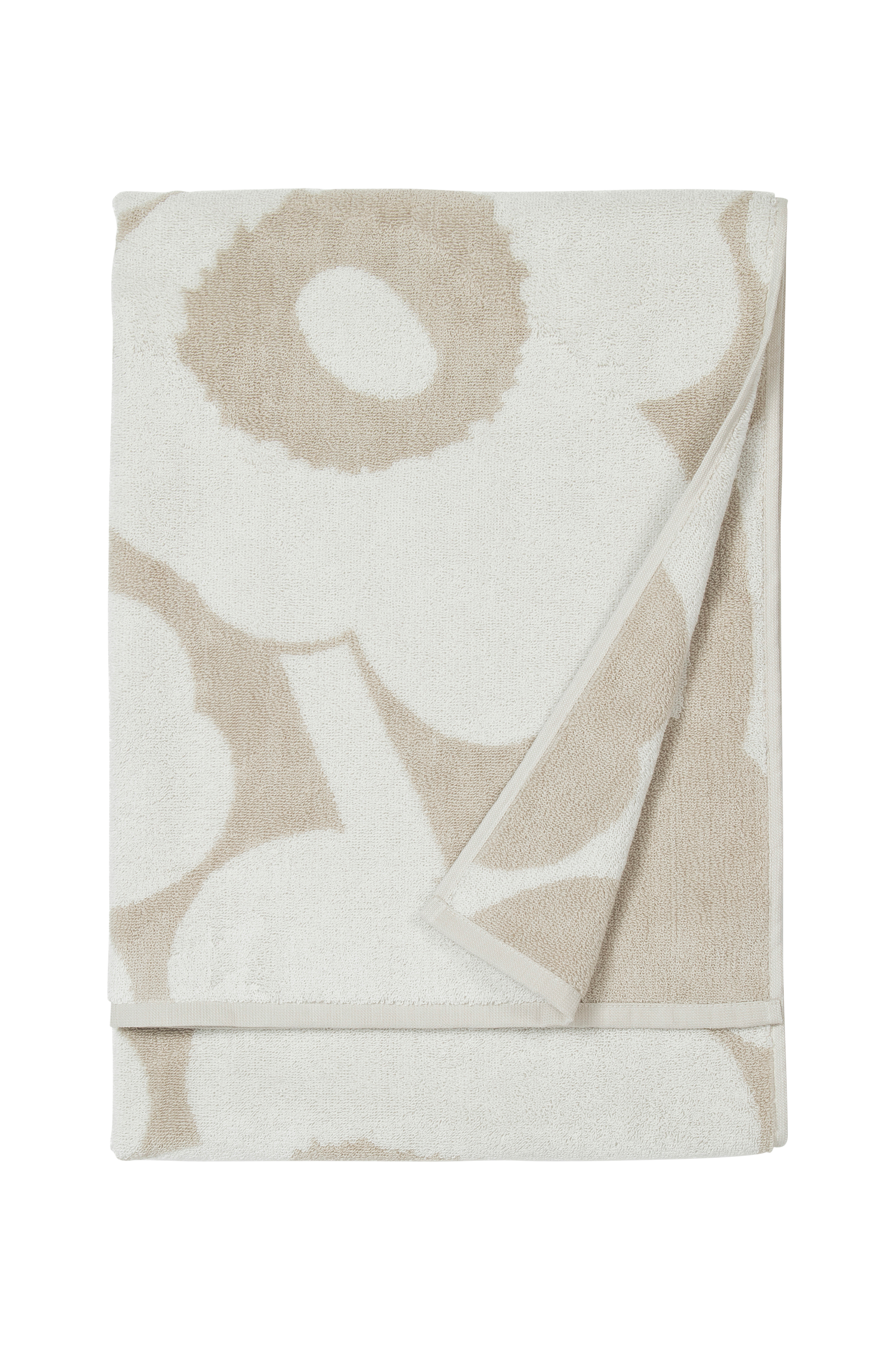 Badhandduk i bomullsfrotté med mönstret Unikko (vallmo) i beige och vitt. Marimekkos berömda vallmomönster Unikko skapades 1964, under en period då abstrakta mönster genomsyrande kollektionerna. Formgivaren Maija Isola ville skapa något intressant i detta organiska tema och designade en mängd olika blommönster. Idag symboliserar det ikoniska blommotivet kreativitet.