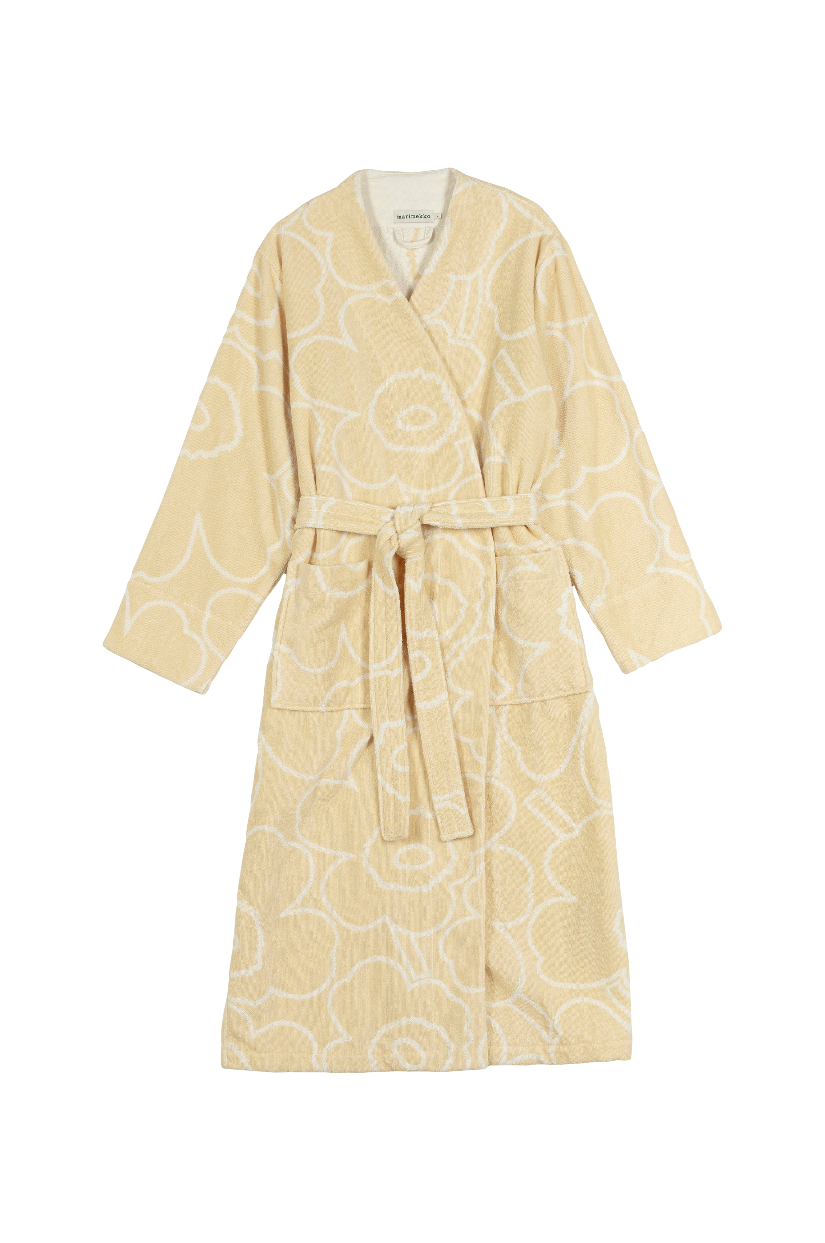 Den mönstrade morgonrocken Piirto Unikko är tillverkad av bomullsfrotté. Morgonrocken har långa ärmar med breda uppvik vid ärmsluten, påsydda fickor framtill, ett separat bälte och bälteshällor. Produkten är tillverkad av 100% ekologisk bomull. Piirto Unikko är en stiliserad, luftig variant av den älskade blomman som skapades av Maija Isola 1964. Den anspelar på minimalism samtidigt som den framhäver de grafiska linjerna i Unikko -mönstret.