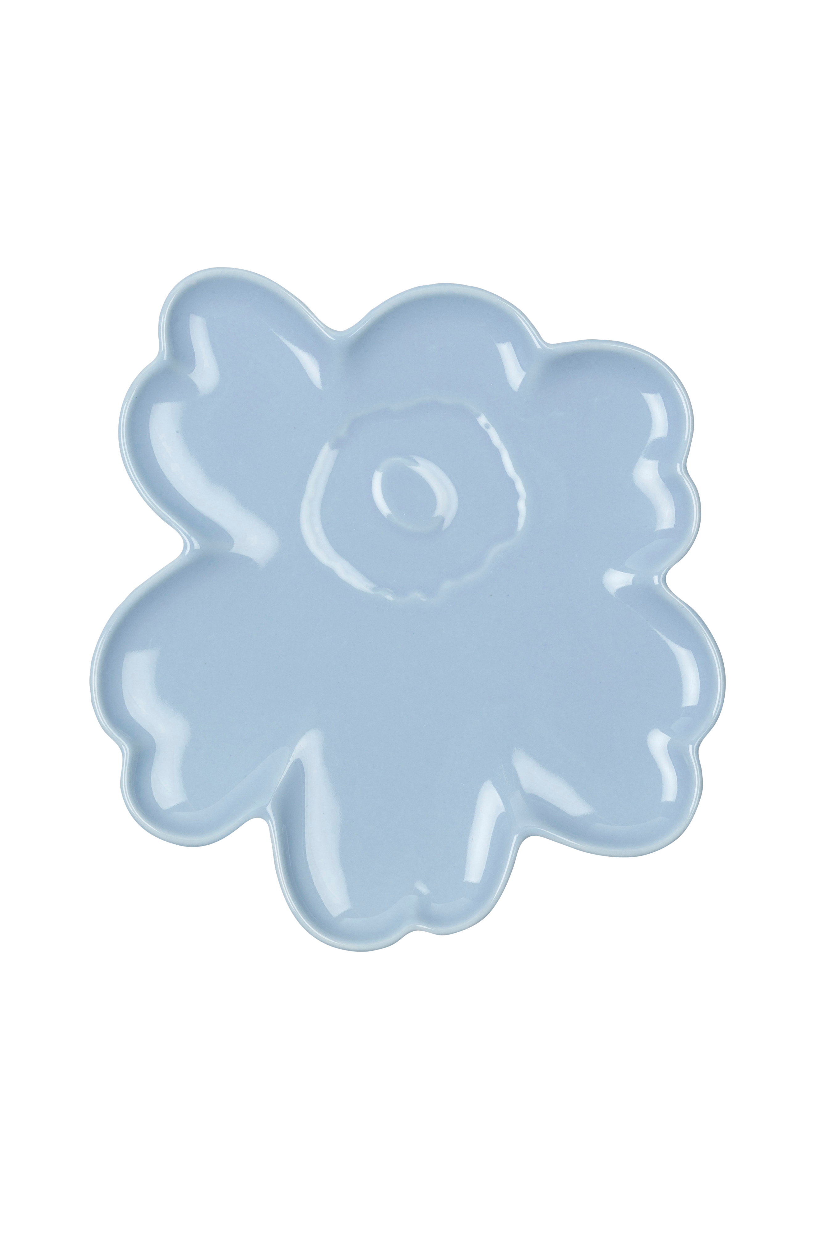 Den blomformade tallriken Unikko är tillverkad av keramik med en ljusblå glasyr. Vi rekommenderar att du diskar tallriken för hand. Den kan visserligen diskas i maskin, men den unika designen kan riskera att skadas om den kommer i kontakt med annan disk. Produkten är förpackad i Marimekko Logo mönsterlåda. 20 cm lång. Tvättas för hand