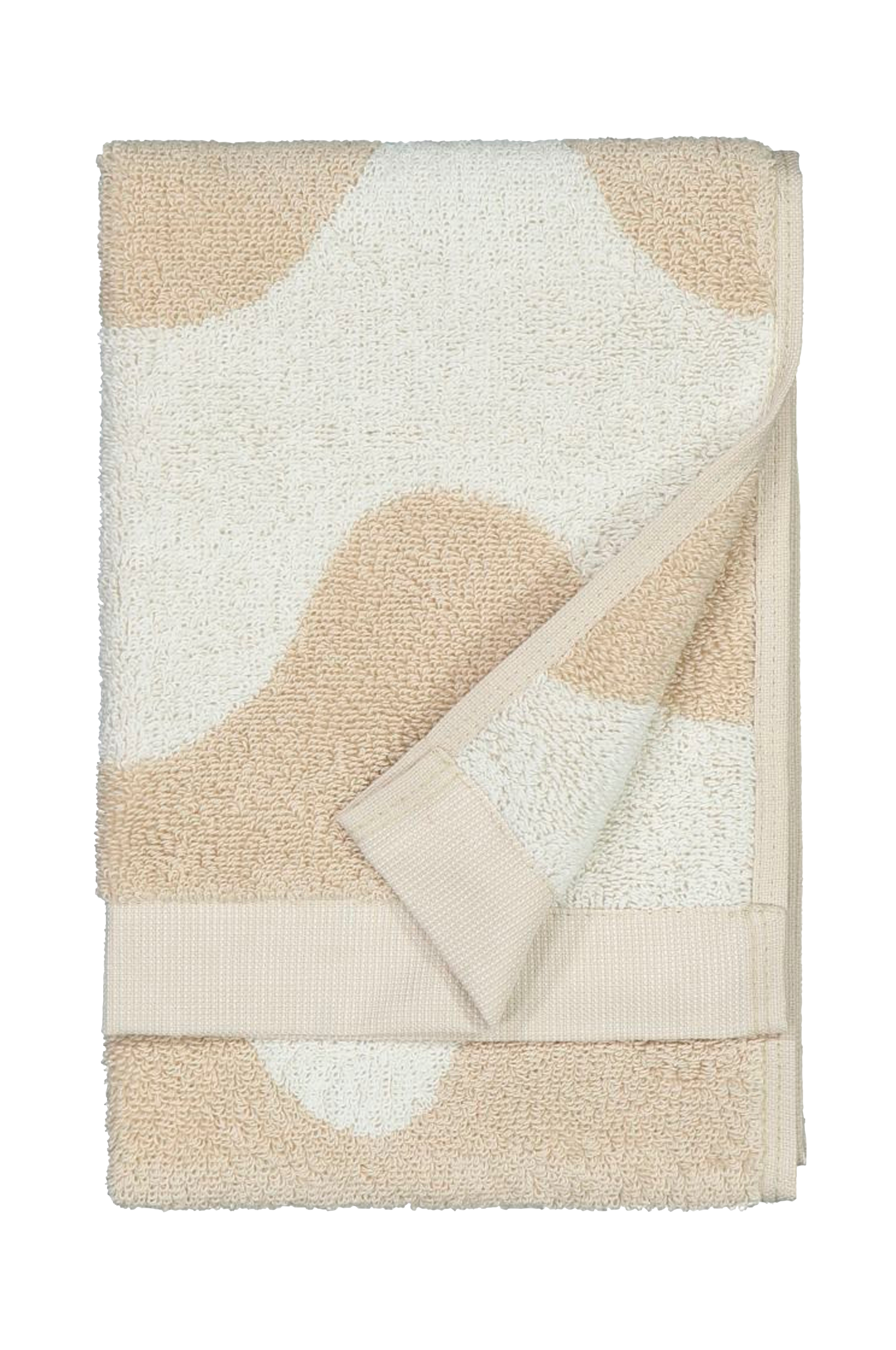 Gästhandduk LOKKI i 100 % bomull. Idén till mönstret Lokki (måsen) kom till Maija Isola när hon tittade på ett fönster med en gardin dragen över den. Solen sken och gardinens breda veck formade vågiga skuggor på tyget. Maija hade en plötslig inspiration: om ett tyg är tryckt med vågor, verkar till och med en liten bit av sådant tyg rikligt, rikt vikta.