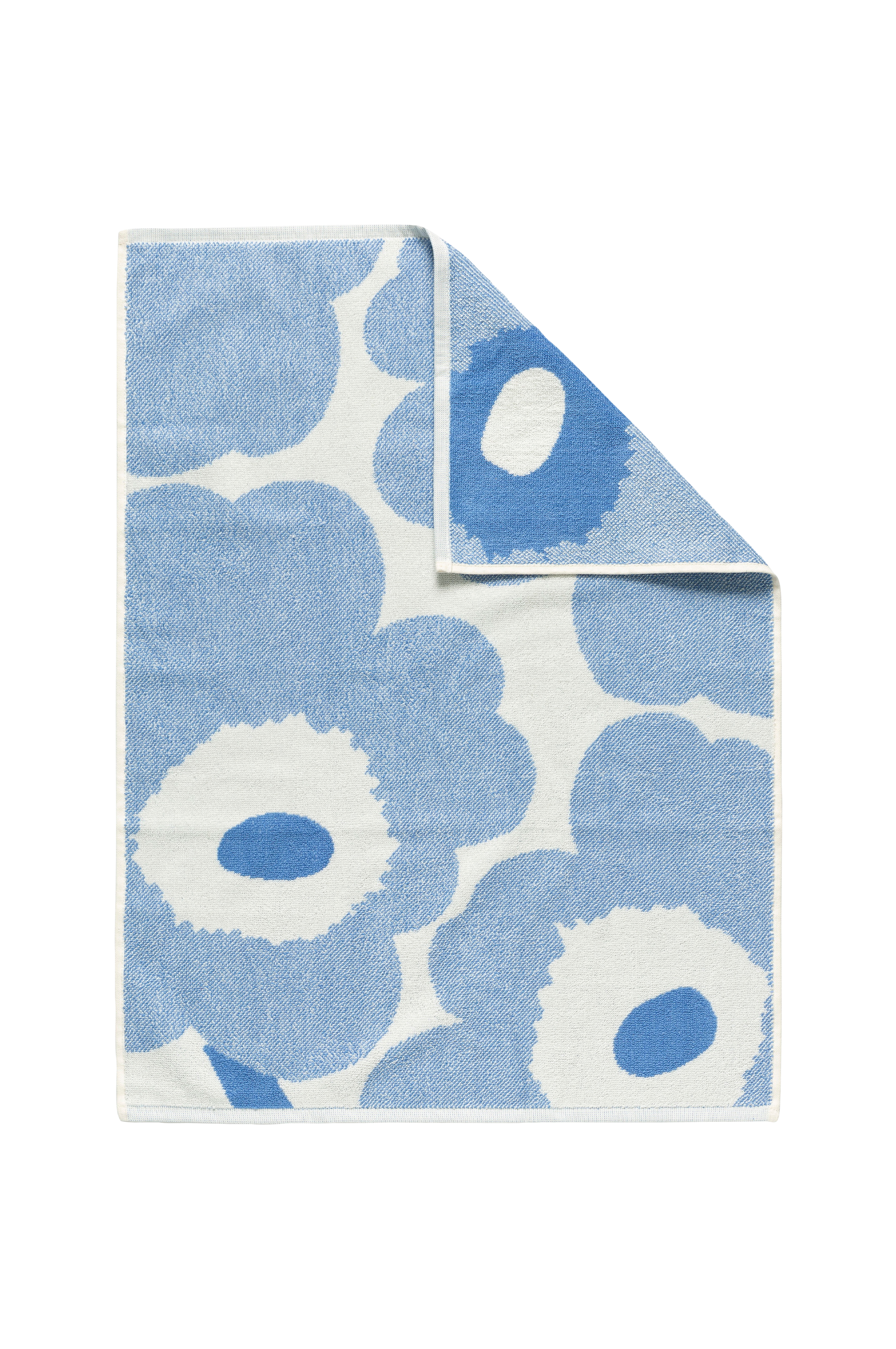 Denna handduk har mönstret Unikko. Handduken är tillverkad av 100% ekologisk bomullsfrotté. Unikko Marimekko, som symboliserar kreativitet, föddes i en tid då knappt några blommönster ingick i Marimekkos kollektioner. Maija Isola var dock fascinerad av temat blommor och bestämde sig för att skapa en hel serie med nya blommönster.