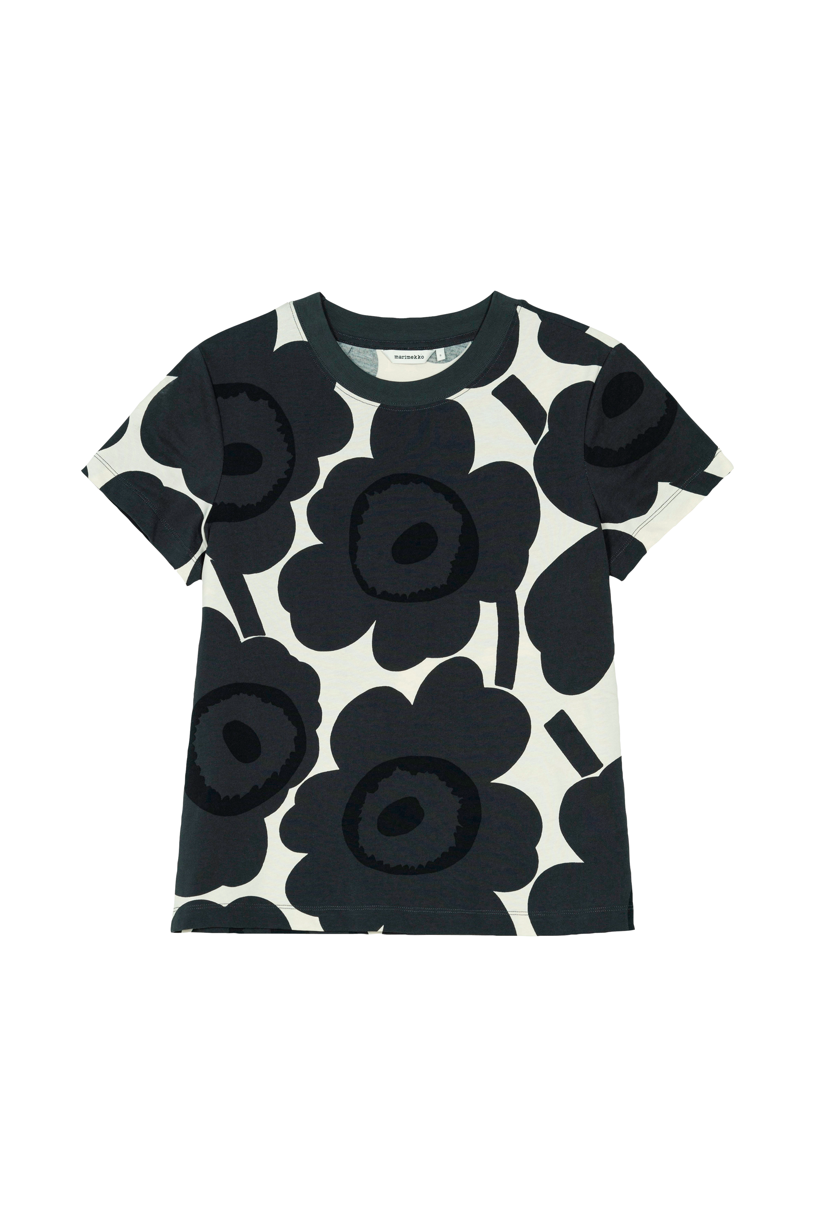 Toppen Heleys är tillverkad av bomullsjersey och har en smal, rak passform. Den kortärmade toppen har Unikko -mönstret och en O-ringning med ribbad avslutning.