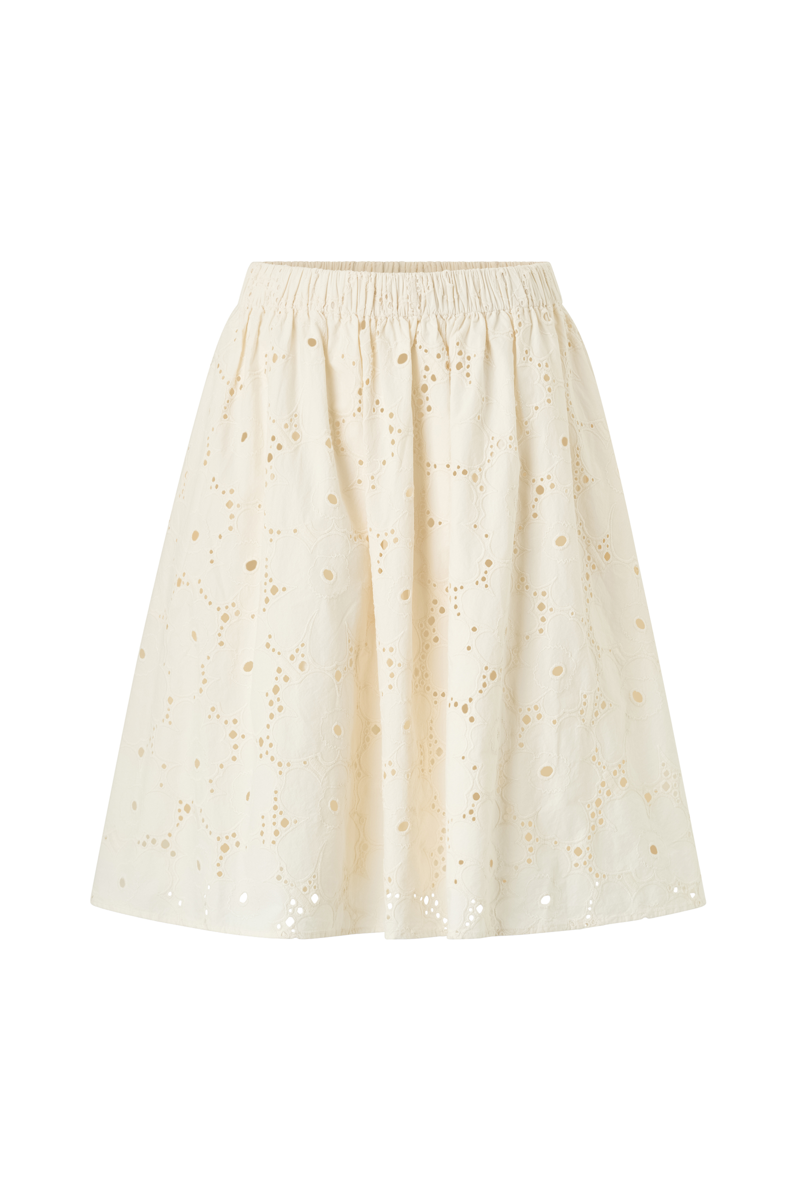 Kjolen Sommittelu har en avslappnad A-linjeformad passform och är mönstrad med broderie anglaise Unikko. Kjolen har en ribbad elastisk linning och fickor i sidsömmen. Kjolen är fodrad.