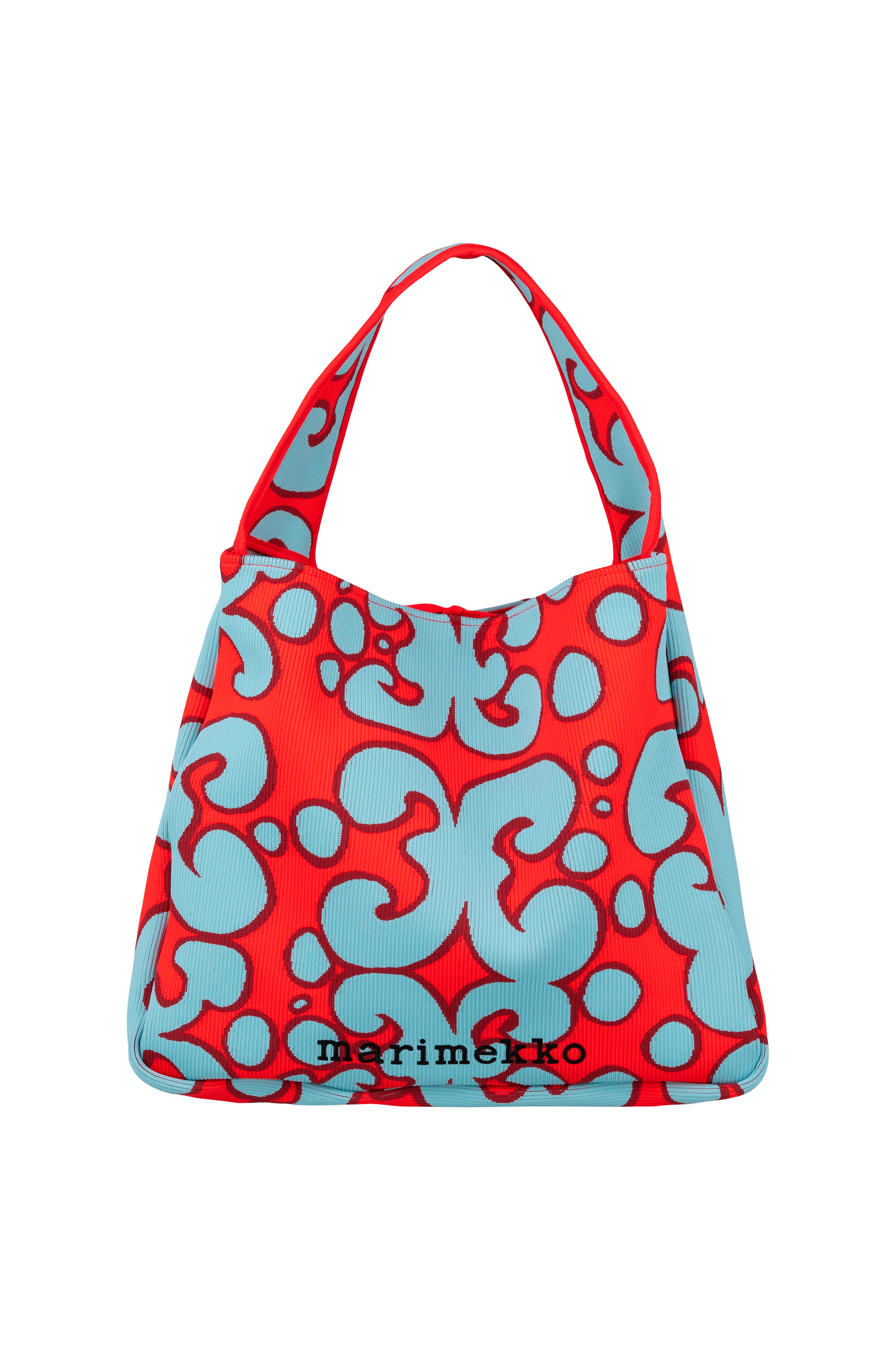 Knitted Bag Large shoulder bag har det jacquardstickade Keidas -mönstret. large bag har en bred axelrem, en bandstängning och den broderade Marimekko-logotypen på framsidan. 48 x 40 x 10.