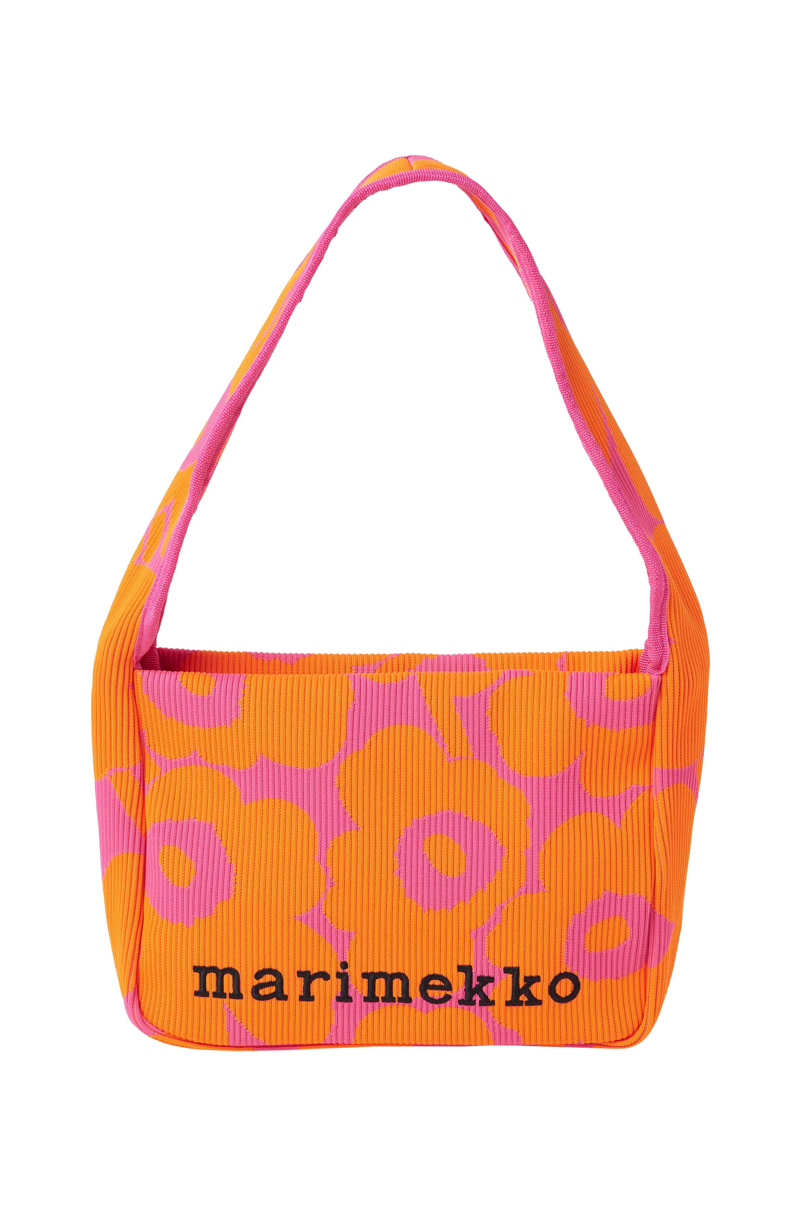 Knitted Shoulderbag har det jacquardstickade Unikko -mönstret och är tillverkad av fast återvunnen polyester med ribbad look. Väskan har en bred axelrem, dragkedjestängning och den broderade Marimekko-logotypen på framsidan.