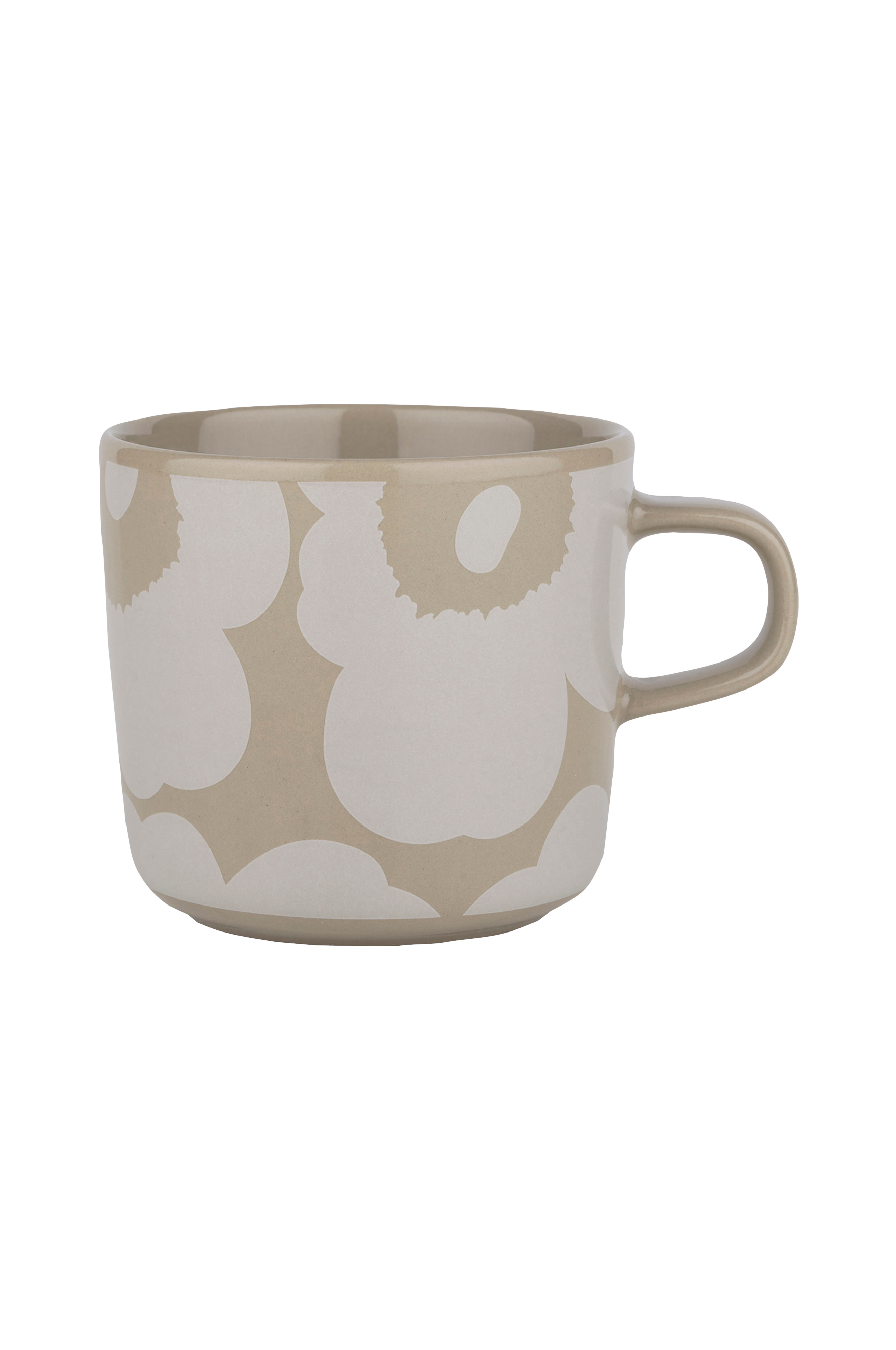 Oiva kaffekopp av brunt stengods med det lätt genomskinliga mönstret Unikko. Koppen tål diskmaskin, ugn, mikrovågsugn och frys. Ta bort klistermärket från produktens botten före användning. Klistermärket innehåller en liten mängd metall. Marimekkos berömda vallmomönster Unikko skapades 1964, under en period då abstrakta mönster genomsyrande kollektionerna. Formgivaren Maija Isola ville skapa något intressant i detta organiska tema och designade en mängd olika blommönster. Idag symboliserar det ikoniska blommotivet kreativitet.