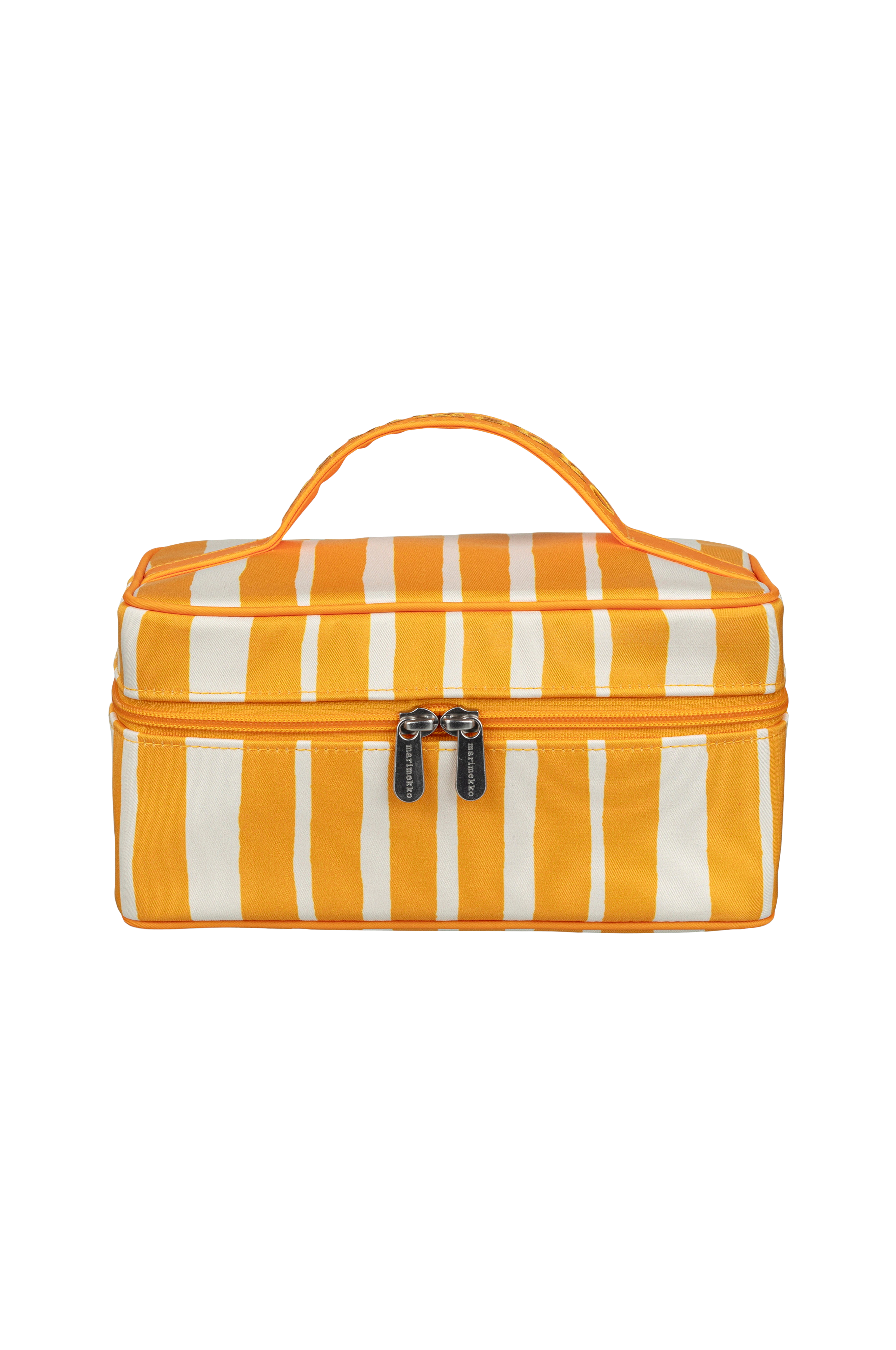 Kosmetikaväskan Tuttu har Raide-mönster. Kosmetikaväskan har ett handtag på locket och försluts med dragkedja. Den är fodrad på insidan och det finns elastiska band för att hålla borstar på plats. Kosmetikaväskan är tillverkad av 100% återvunnen polyester. Ränder har alltid varit en integrerad del av Marimekkos mönstervärld. Den livfulla frihandsmönstret Raide (järnvägsspår) är en av de otaliga Marimekko-remsor som Annika Rimala har skapat. 22x13x11 cm
