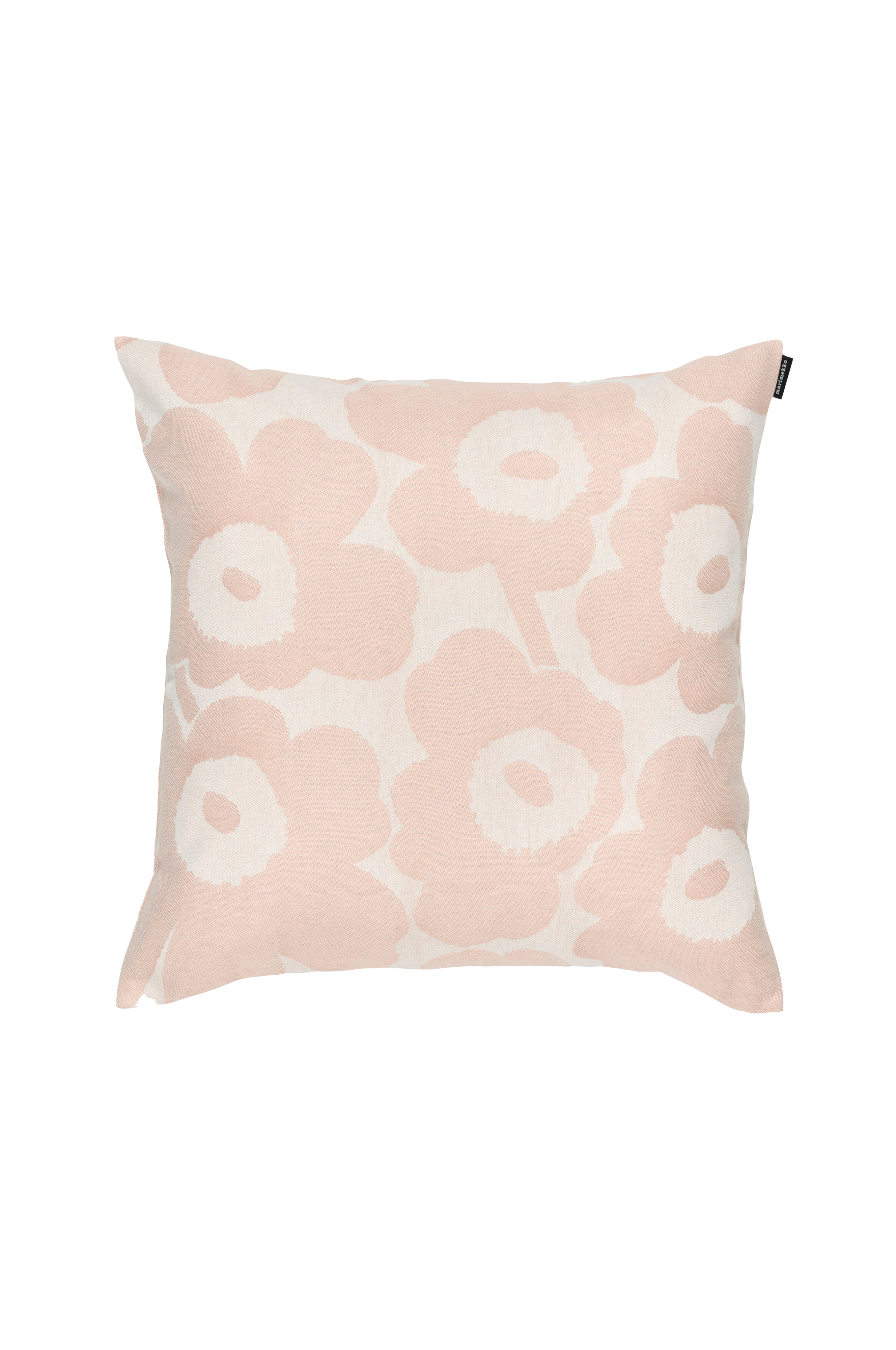 Kuddfodralet Pieni Unikko med mönster är tillverkat av en jacquardstickad bomulls- och linneblandning. Överdraget har en dold dragkedja på ena sidan. Produkter som är vävda med jacquardteknik kan variera något i storlek. Unikko skapades av Maija Isola 1964 och har sedan dess blivit en internationell ikon för tryckt design. Marimekkos grundare, Armi Ratia, ansåg att det inte var möjligt att på ett trovärdigt sätt fånga den sanna essensen av riktiga blommor i tryck, vilket var anledningen till att blommiga tryck tidigare uteslöts från Marimekkos kollektioner. Maija Isola designade därför Unikko som en abstraktion av en blomma snarare än en fotorealistisk återgivning. Idag är Unikko en kraftfull symbol för glädje och kreativitet, sömlöst integrerad i Marimekkos designidentitet.
