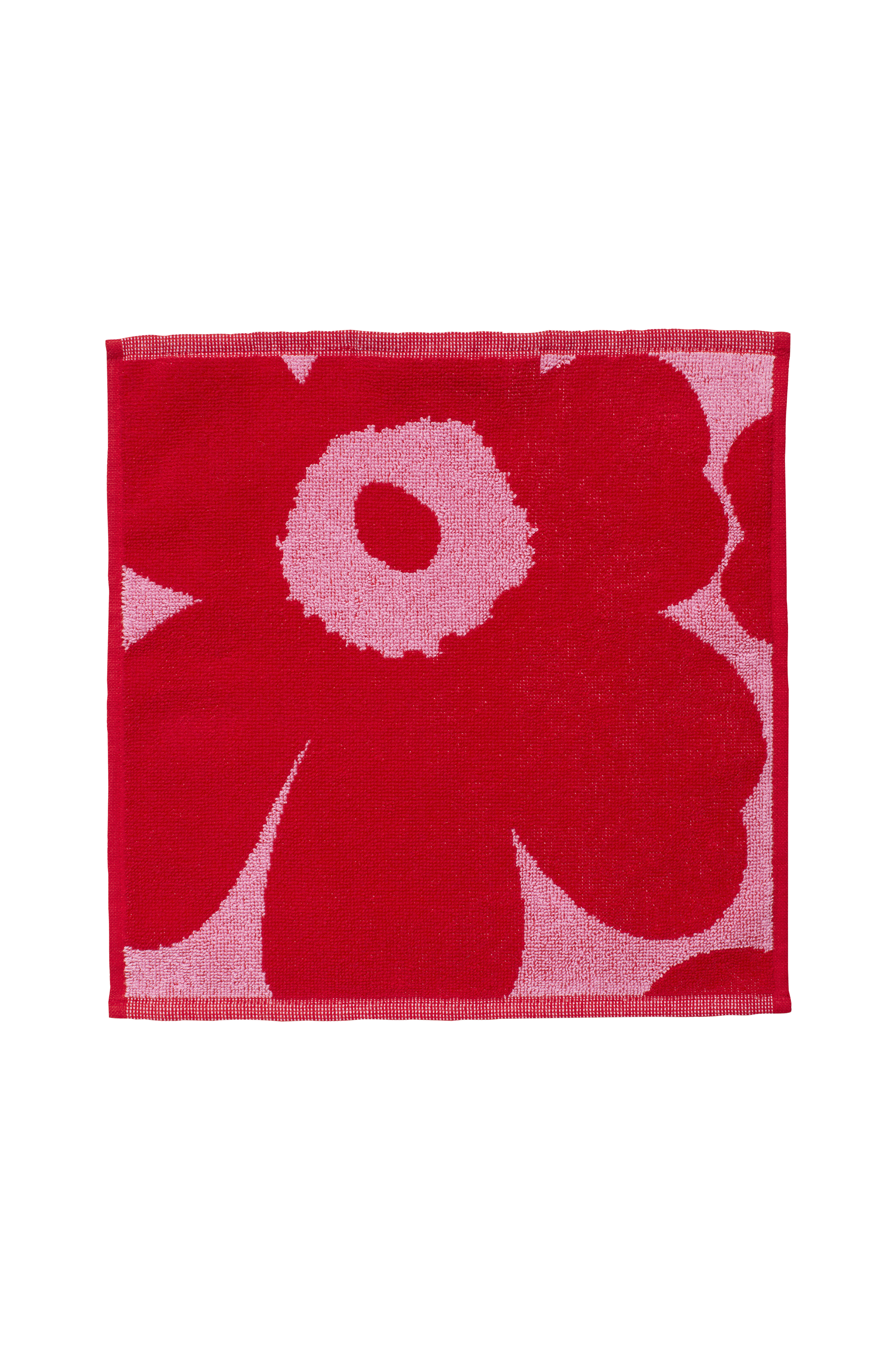 Handduk i bomullsfrotté med mönstret Unikko. Marimekkos berömda vallmomönster Unikko skapades 1964, under en period då abstrakta mönster genomsyrande kollektionerna. Formgivaren Maija Isola ville skapa något intressant i detta organiska tema och designade en mängd olika blommönster. Idag symboliserar det ikoniska blommotivet kreativitet.