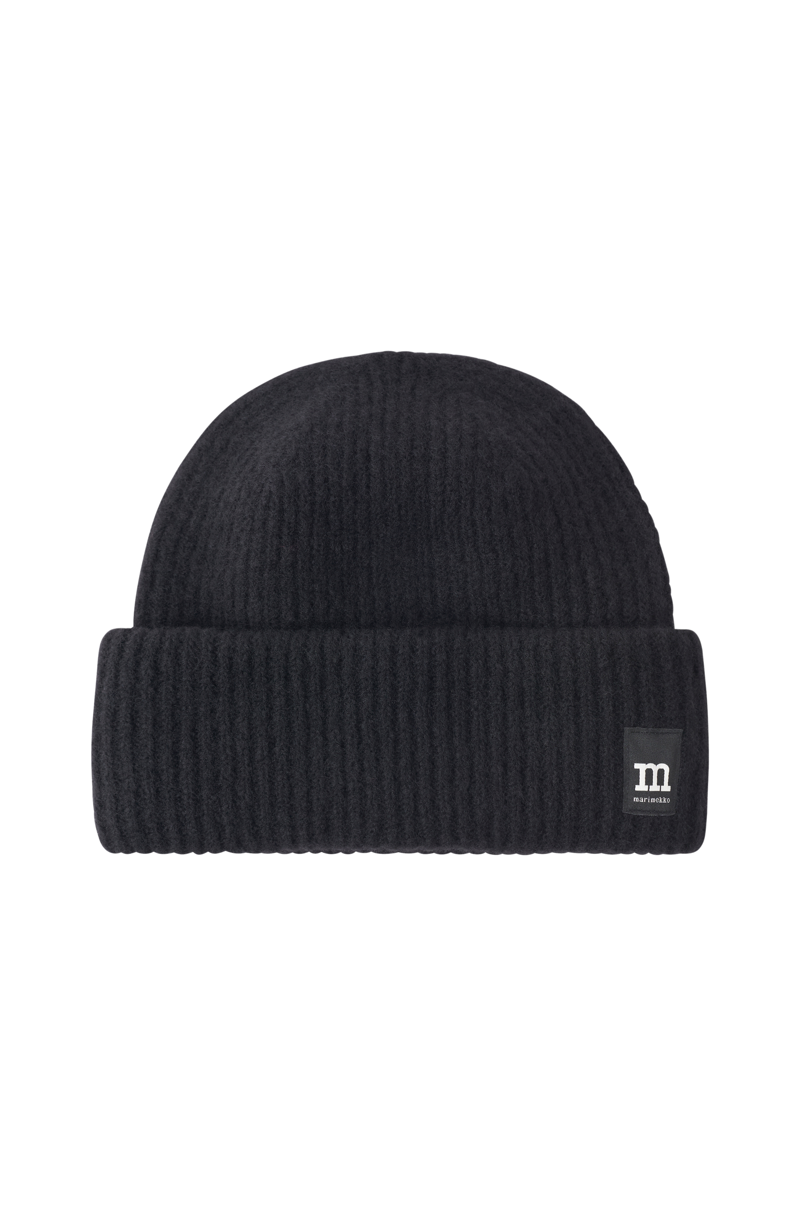 Den stickade tjocka mössan från Pjettar har en fåll som är vikt två gånger och Marimekko-märket finns på framsidan.