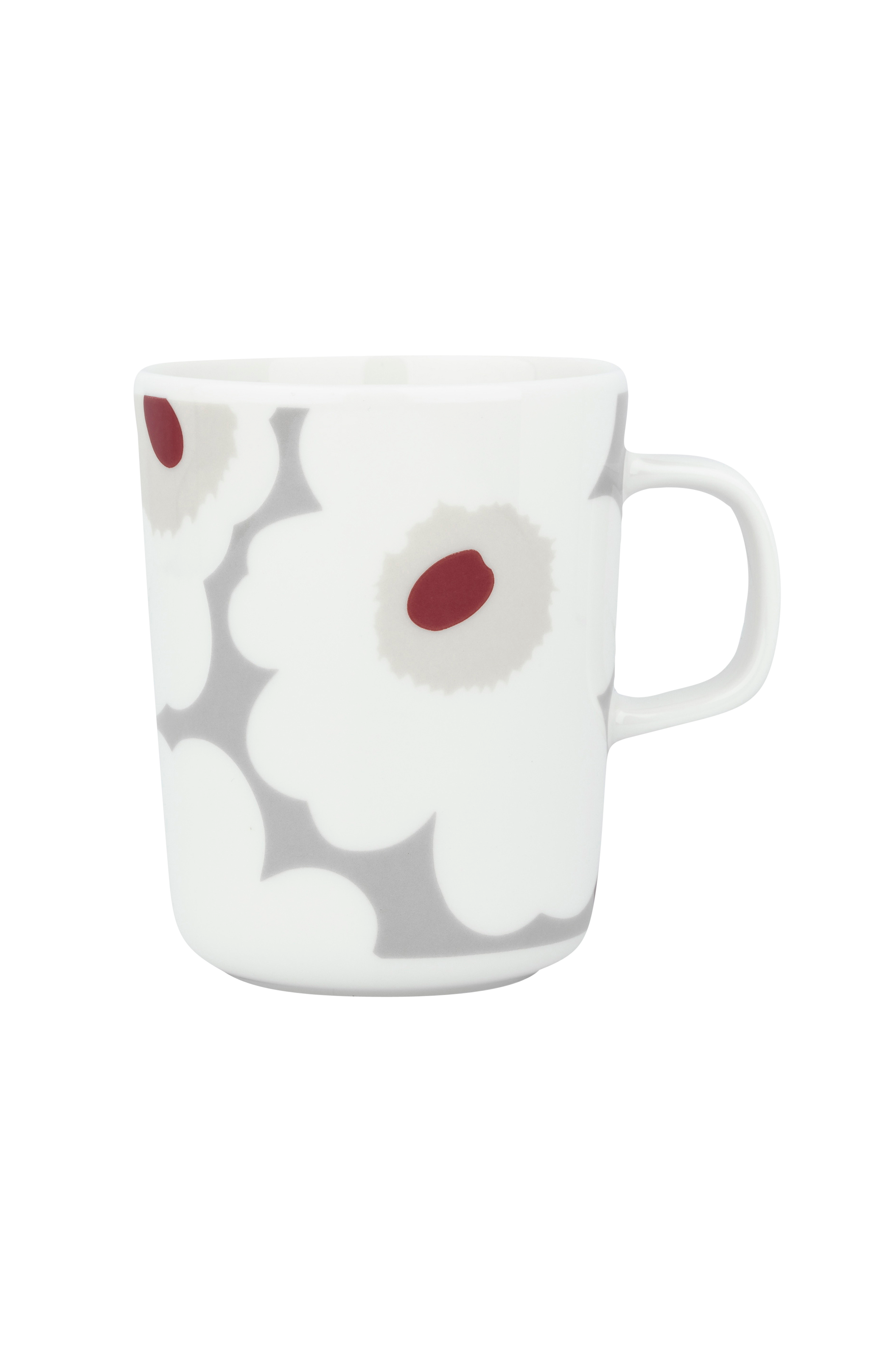Oiva-muggen är tillverkad av vitt stengods som tål maskindisk, ugn, mikrovågsugn och frys. Ta bort klistermärket från botten av produkten före användning. Klistermärket innehåller en liten mängd metall. Unikko (vallmo), som symboliserar kreativitet, föddes under en tid då nästan inga blommönster ingick i Marimekkos kollektioner. Maija Isola fascinerades dock av temat blommor och bestämde sig för att skapa en hel serie med nya blommönster.
