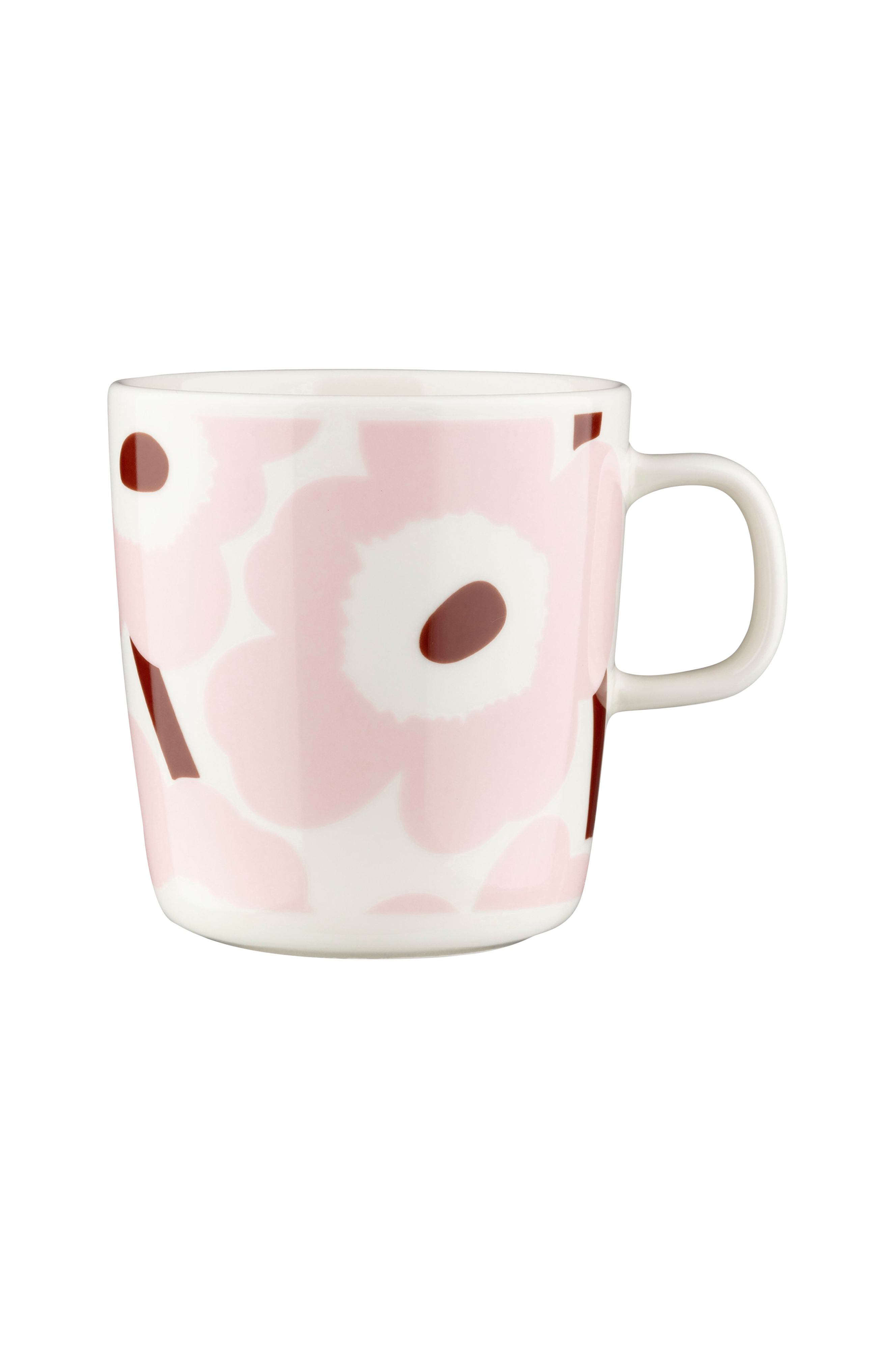 Den stora Oiva-muggen med Unikko -mönster är tillverkad av vitt stengods som tål maskindisk, ugn, mikrovågsugn och frys. Ta bort klistermärket från undersidan av produkten före användning. Klistermärket innehåller en liten mängd metall.