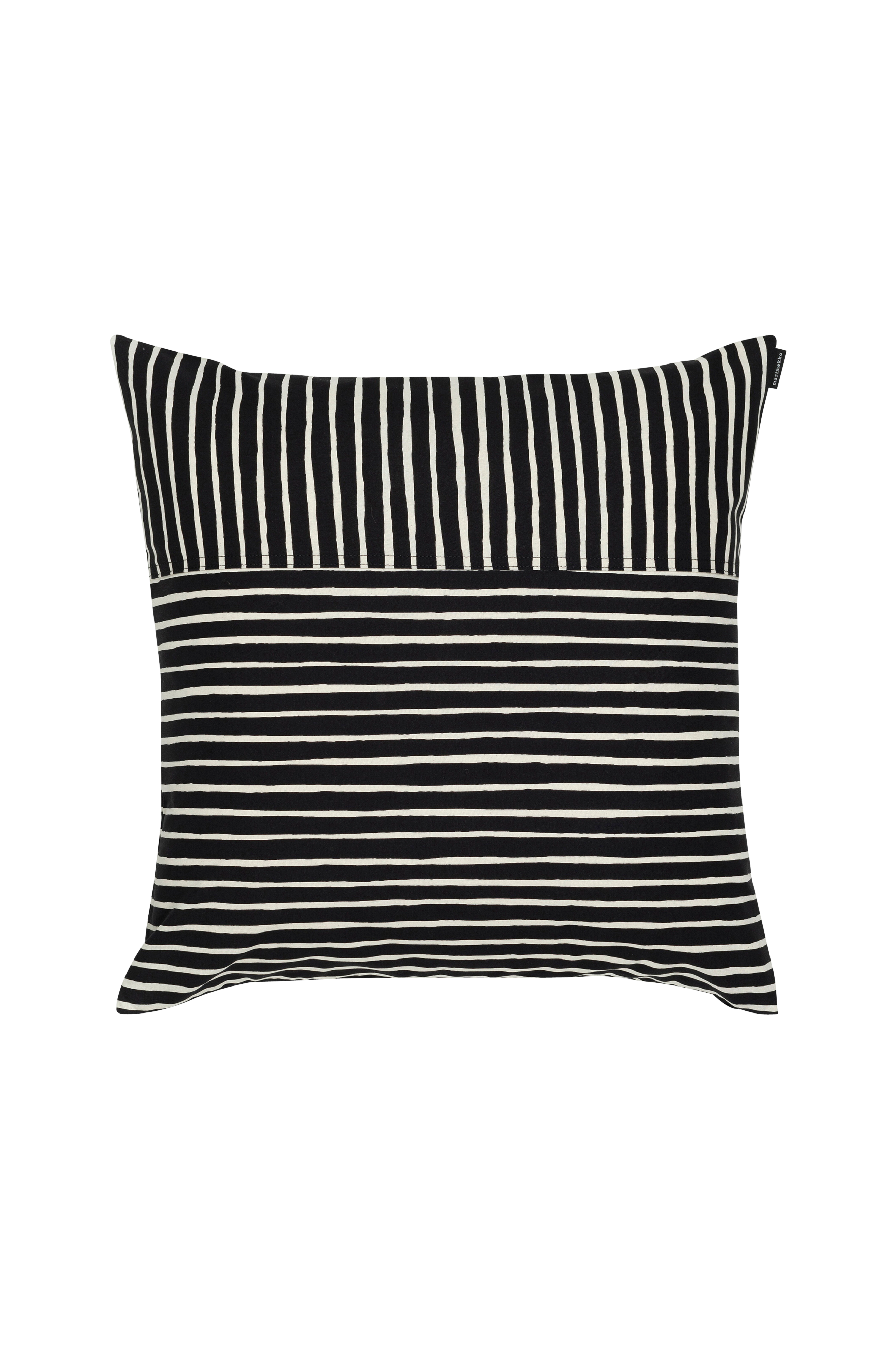 Detta kuddfodral i bomull har mönstret Piccolo, som är tryckt i Helsingfors. Överdraget är sytt i två delar, vilket gör att mönstret löper i två olika riktningar. Överdraget har en dold dragkedja på ena sidan och sömmarna är dubbelsydda. 25% av den bomull som används i denna produkt är ekologisk och 25% är återvunnen. 1953, samma år som hon började på Marimekko, skapade Vuokko Eskolin-Nurmesniemi Piccolo, ett randigt tygmönster målat med livfulla penseldrag. Tre år senare dök skjortan Jokapoika (varje pojke), som var tillverkad av tyget, upp i butikerna och på gatorna - för gott, verkar det som.