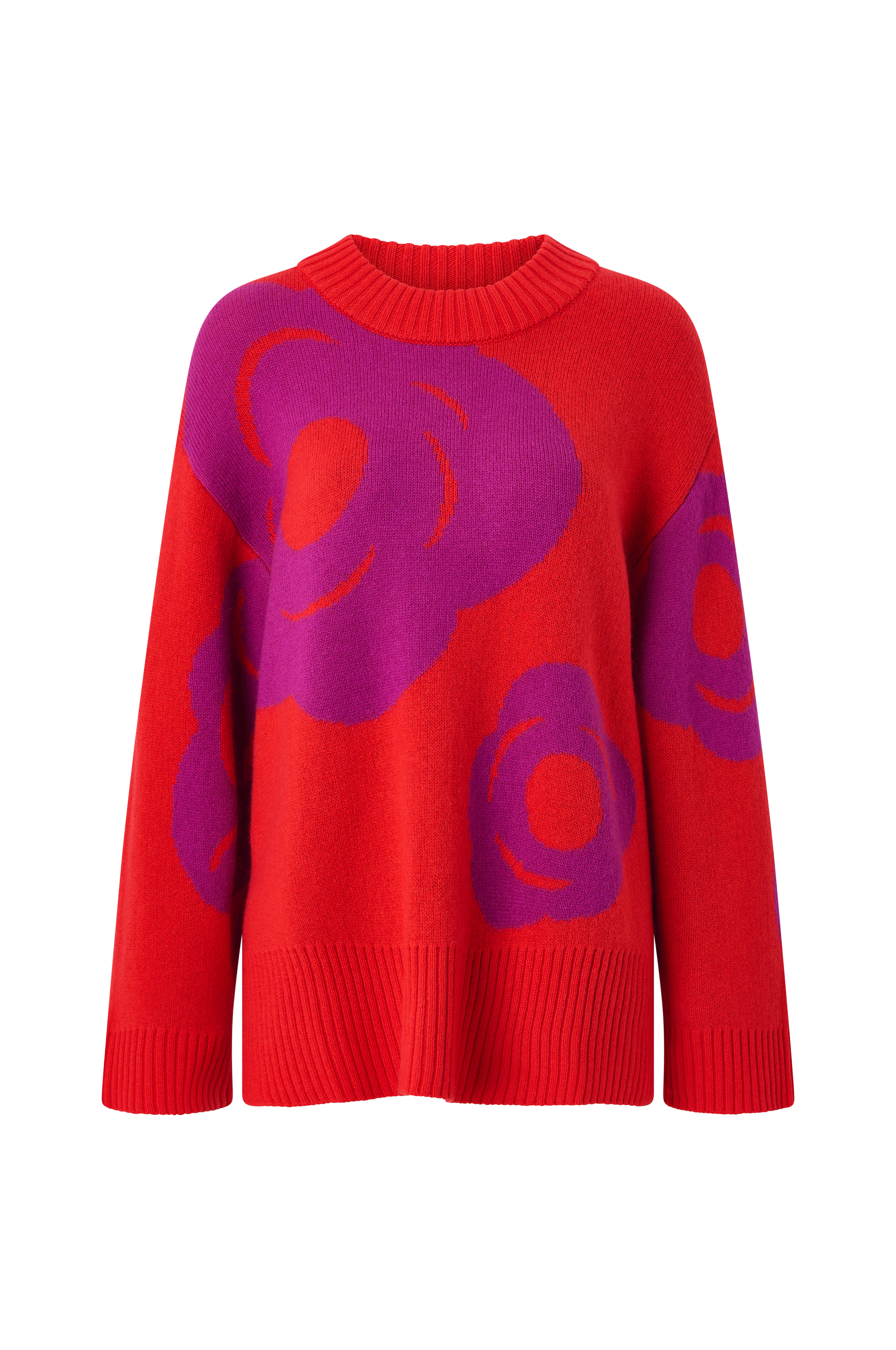Den stickade tröjan Kartakteri har en överdimensionerad, rak passform. Den jacquardstickade tröjan har mönstret Tumma och har en dubbelribbad O-ringning och breda ribbningar i ärmslut och nederkant. Det finns sidoslitsar vid fållen.