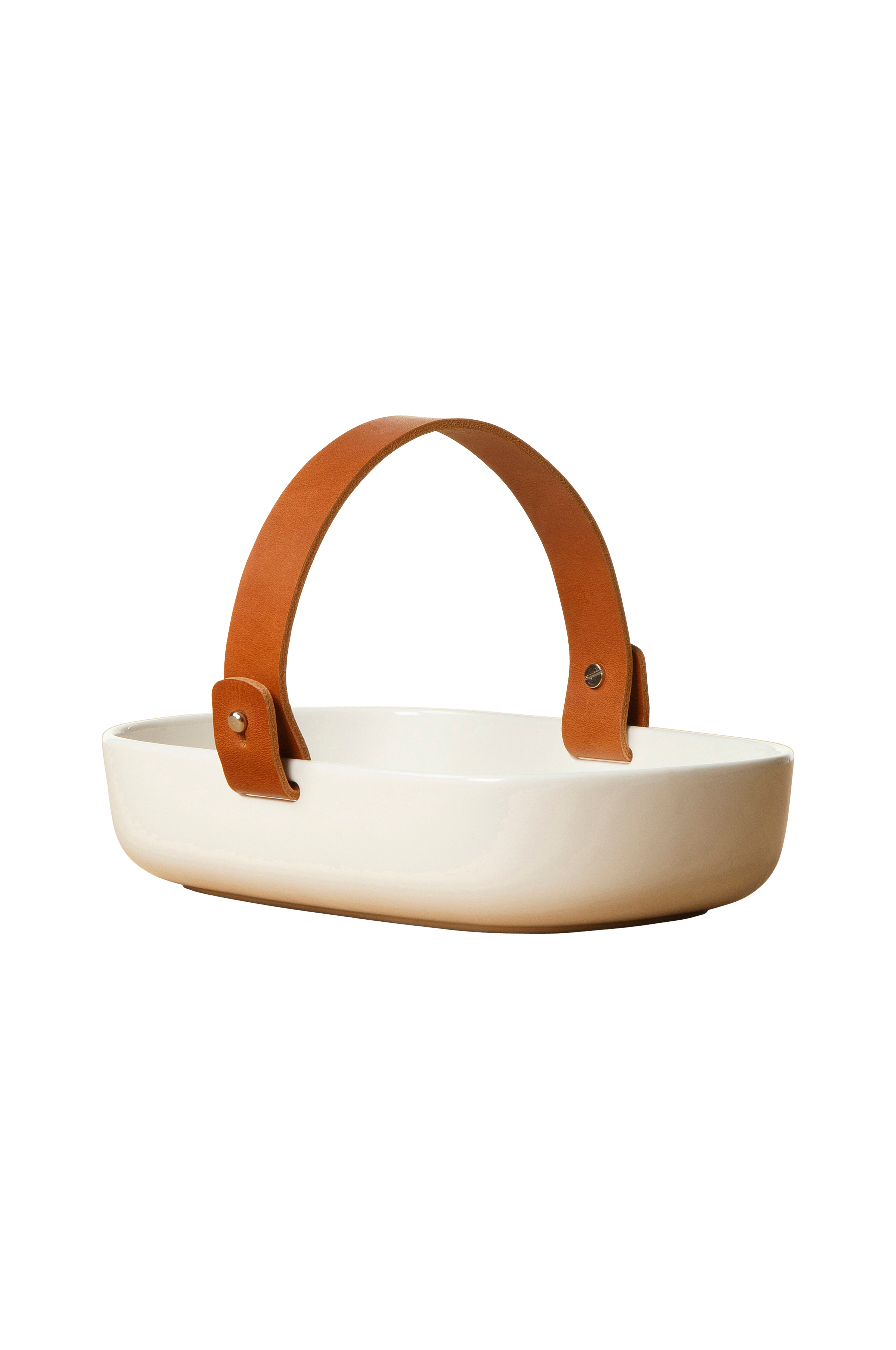 Vitt serveringsfat i stengods med avtagbart handtag i läder. Ta bort handtaget före disk.
