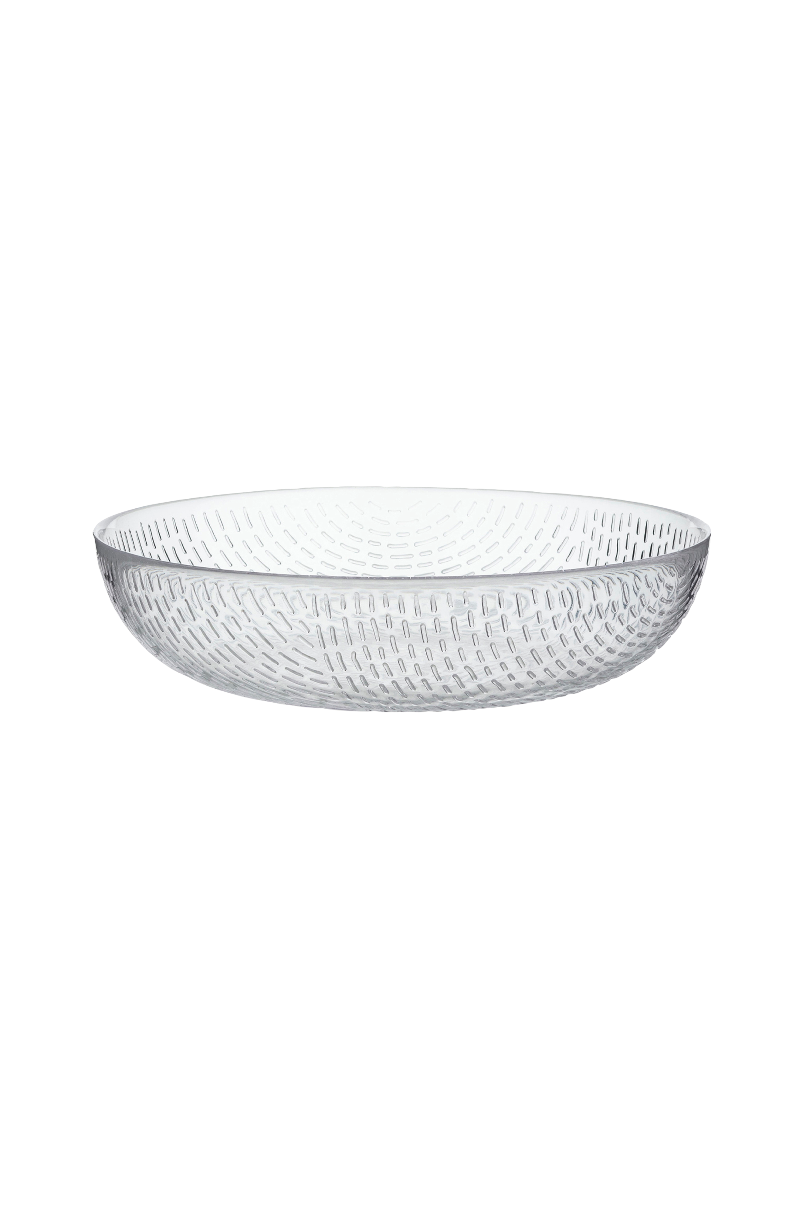 Serveringsskålen Syksy är tillverkad av munblåst glas. Skålen är förpackad i en Marimekko Logo mönsterlåda. Glasserien Syksy (höst), formgiven av Matti Klenell, fortsätter att utforska natur- och väderfenomen som är välbekanta från Marimekkos grafiska konst. Det övergripande temat för den nya serien är höstregnets former, från ett milt duggregn till kraftfulla, genomdränkta skyfall. En sofistikerad, nyanserad och påtaglig känsla av regn har fångats i glasprodukterna som en organisk, reliefliknande ytstruktur som applicerats på ytan på ett skissartat sätt som är typiskt för formgivaren. Marimekkos glasföremål är munblåsta i en form. Eftersom de tillverkas för hand kan de innehålla enstaka luftbubblor och andra små tecken på hantverksskicklighet. En viss variation mellan produkterna är naturlig. 23 cm