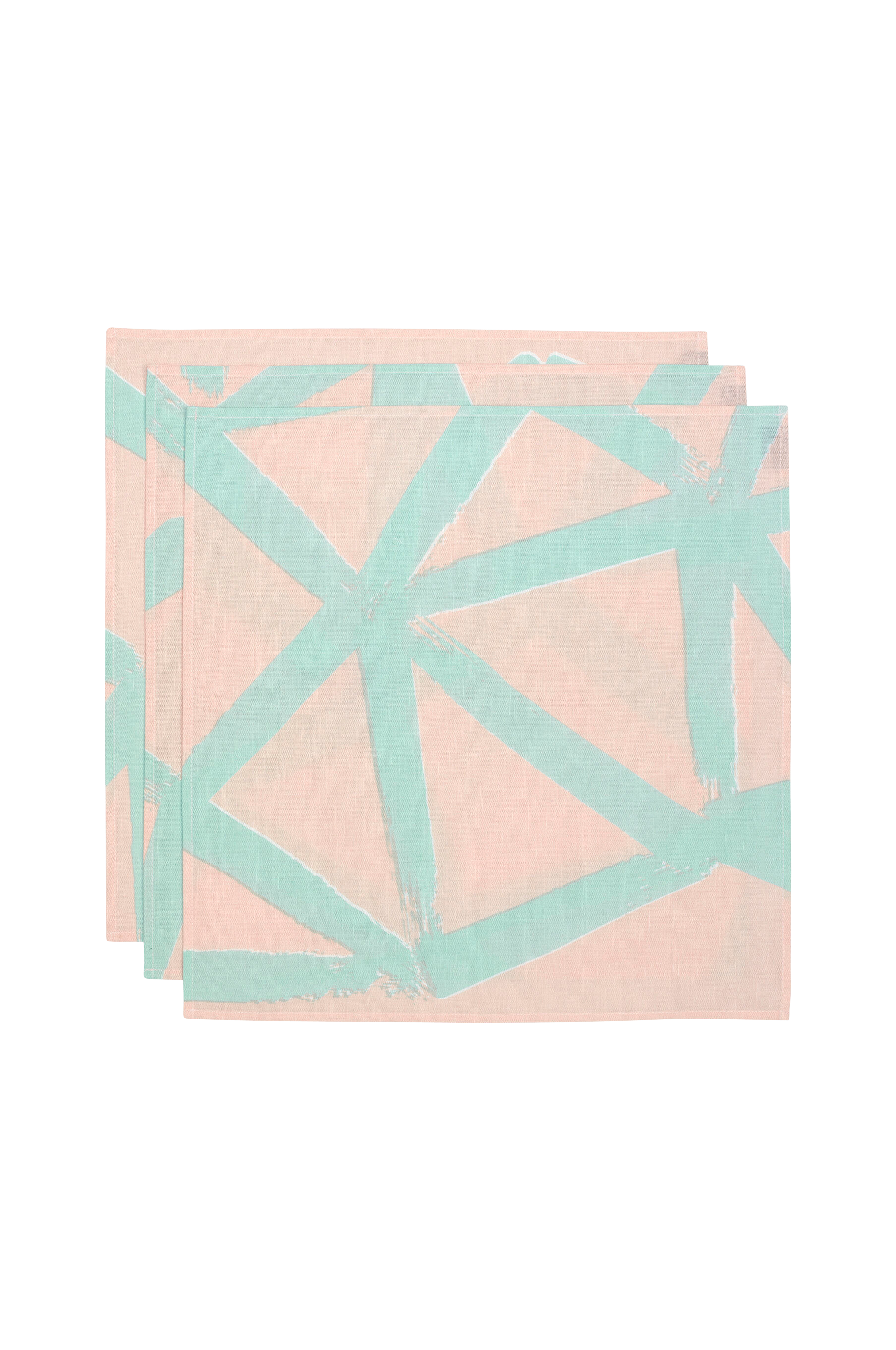 Detta set innehåller tre Ukkospilvi-mönsterservetter som är gjorda av en bomulls- och linneblandning och tryckta i Helsingfors. Servetterna sys i hela tygets bredd, och därför kan deras utseende variera. Varje föremål är unikt.