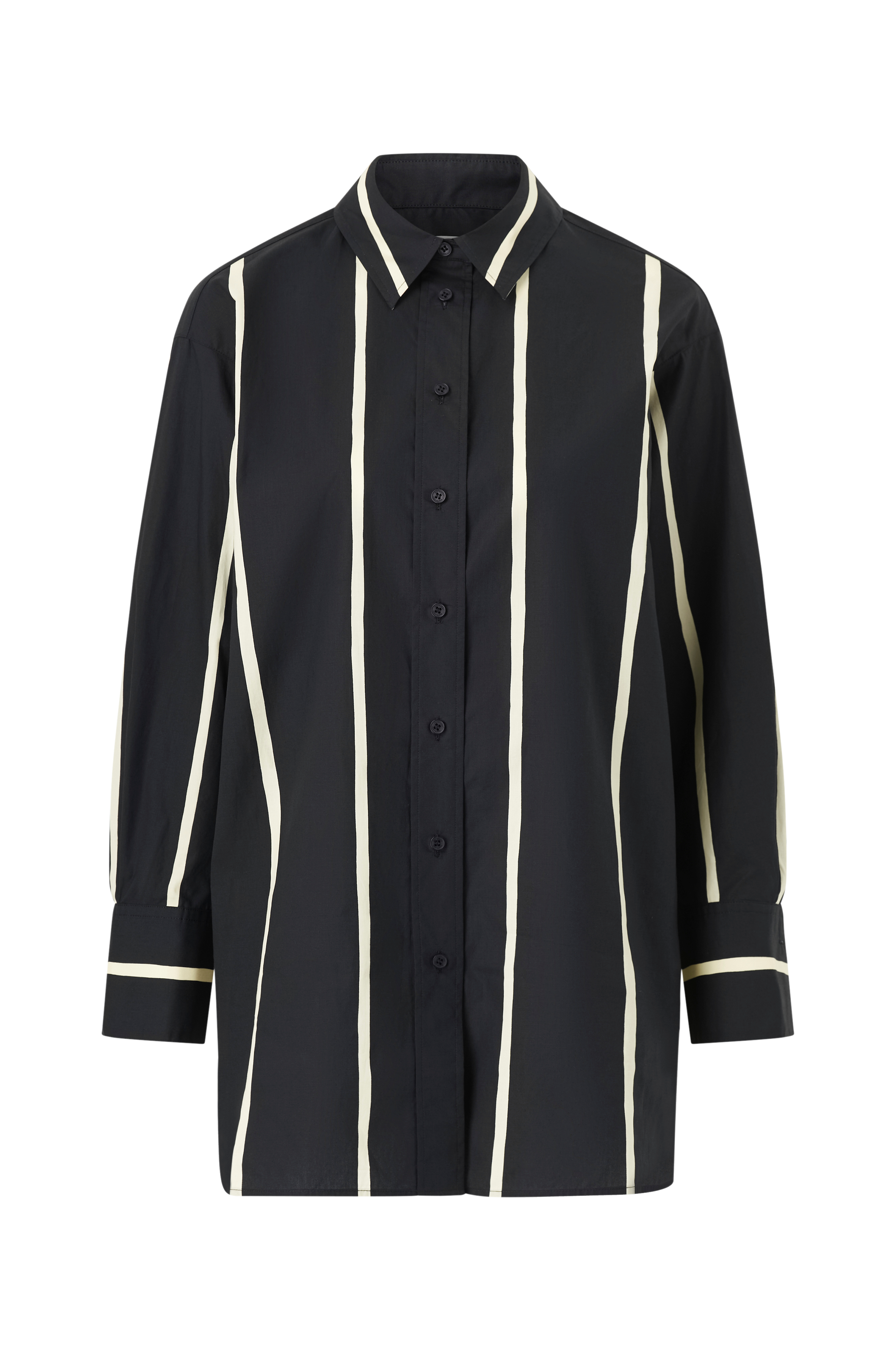 Knappskjortan Nila har en överdimensionerad, rak passform. Skjortan är tryckt i mönstret Puhveli och har en spetsig krage, knapplist och manschettärmar med knappförslutning. Den böjda fållen har slitsar i sidorna.