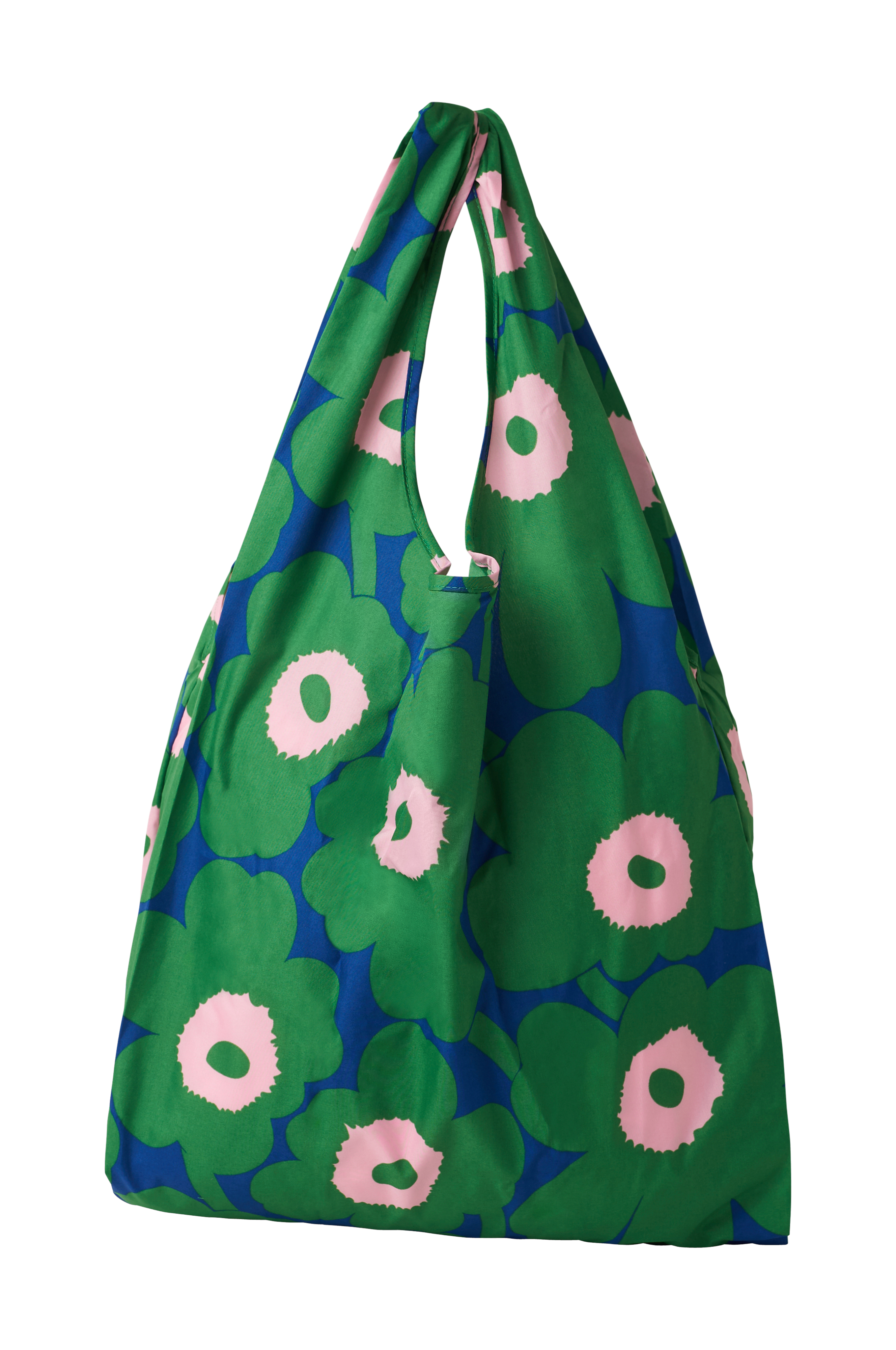 Smartbag är tillverkad av återvunnen polyester i mönstret Unikko. När väskan inte används kan den vikas ihop och förvaras i innerfickan.