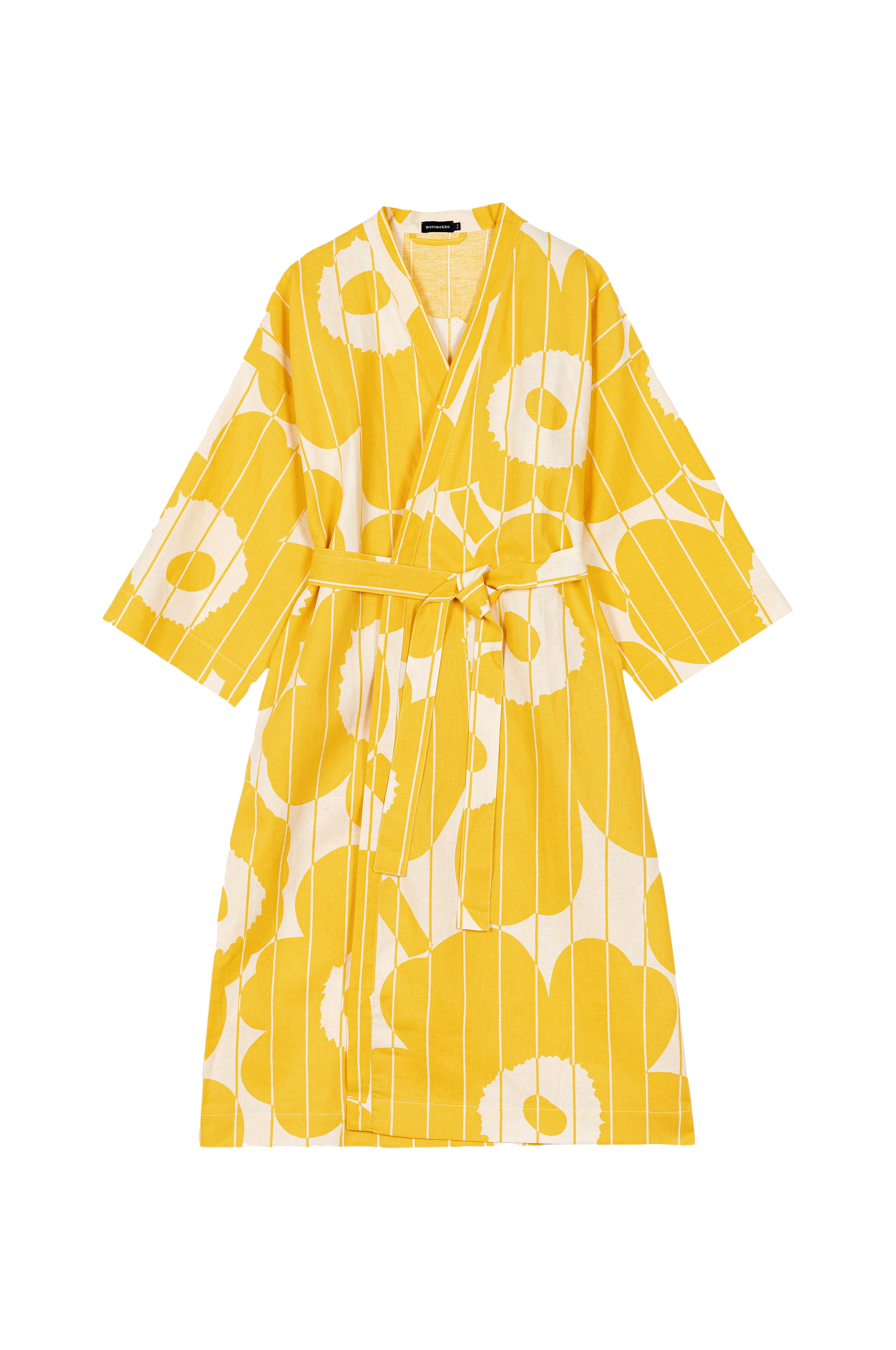 Denna strandrock är tillverkad av våffla i bomulls- och linneblandning i mönstret Vesi Unikko. Badrocken har långa, lösa ärmar som har breda uppvik i ärmsluten. Strandrocken i kimonostil har fickor i sidosömmen och ett avtagbart bälte. Unikko (vallmo), som symboliserar kreativitet, föddes under en tid då nästan inga blommönster ingick i Marimekkos kollektioner. Maija Isola fascinerades dock av temat blommor och bestämde sig för att skapa en hel serie med nya blommönster.