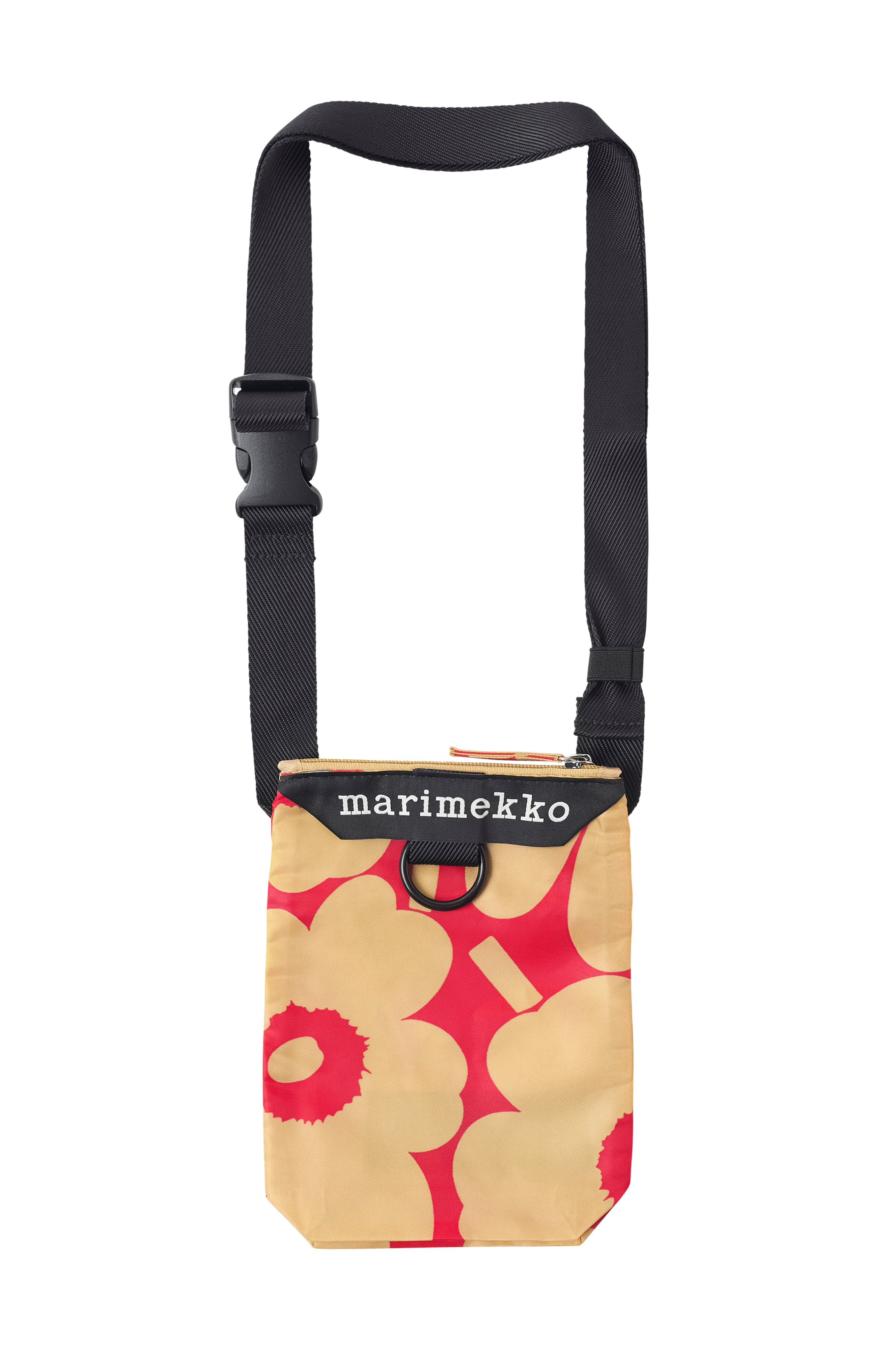 Mobilfodralet Neat Phone Pocket är tillverkat av återvunnen polyester i mönstret Unikko. Väskan har en justerbar axelrem som är tillverkad av återvunnen polyamid och har ett plastspänne. Väskan stängs med dragkedja och har Marimekko-etikett och nyckelring på framsidan.