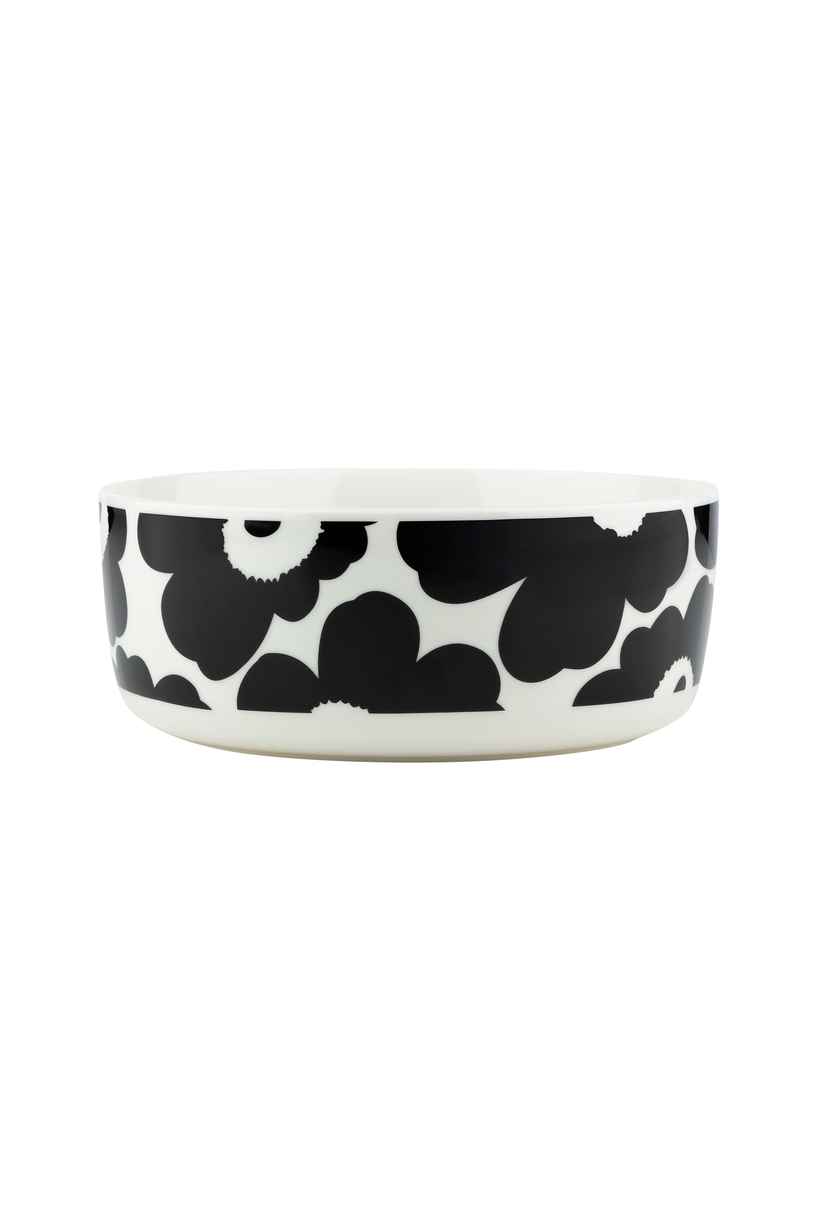 Oiva-servisen bowl med Unikko mönster är tillverkad av vitt stengods som tål maskindisk, ugn, mikrovågsugn och frys.