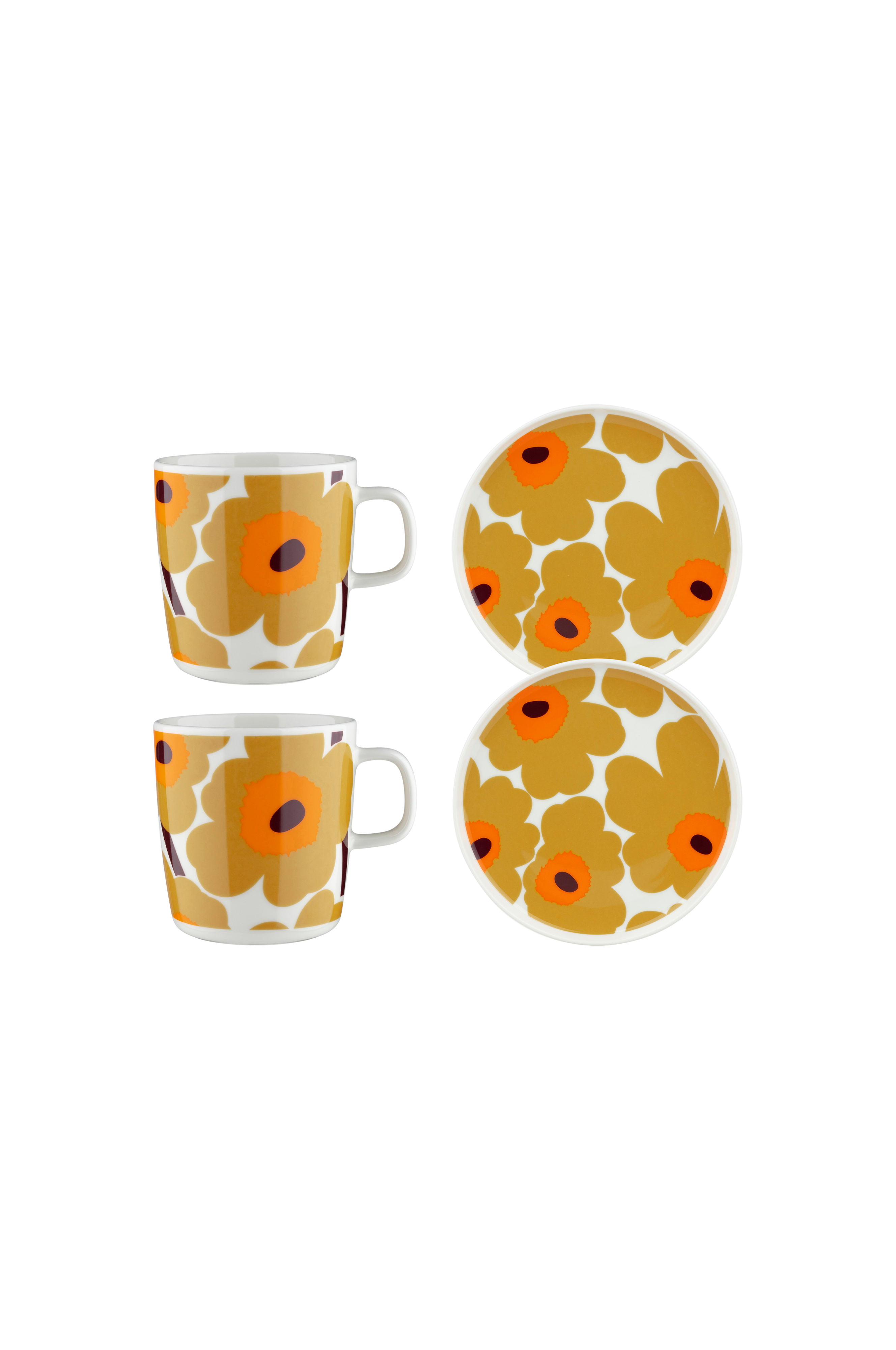 Frukostsetet Oiva med mönstret Unikko består av två 4 dl-muggar och två 20 cm-tallrikar. Setet tål maskindisk, ugn, mikrovågsugn och frys. Produkterna är tillverkade av vitt stengods. Oiva-produkterna är designade av Sami Ruotsalainen. Ta bort klistermärket från undersidan av produkten före användning. Klistermärket innehåller en liten mängd metall. Setet är förpackat i en Marimekko Logo-mönstrad låda.