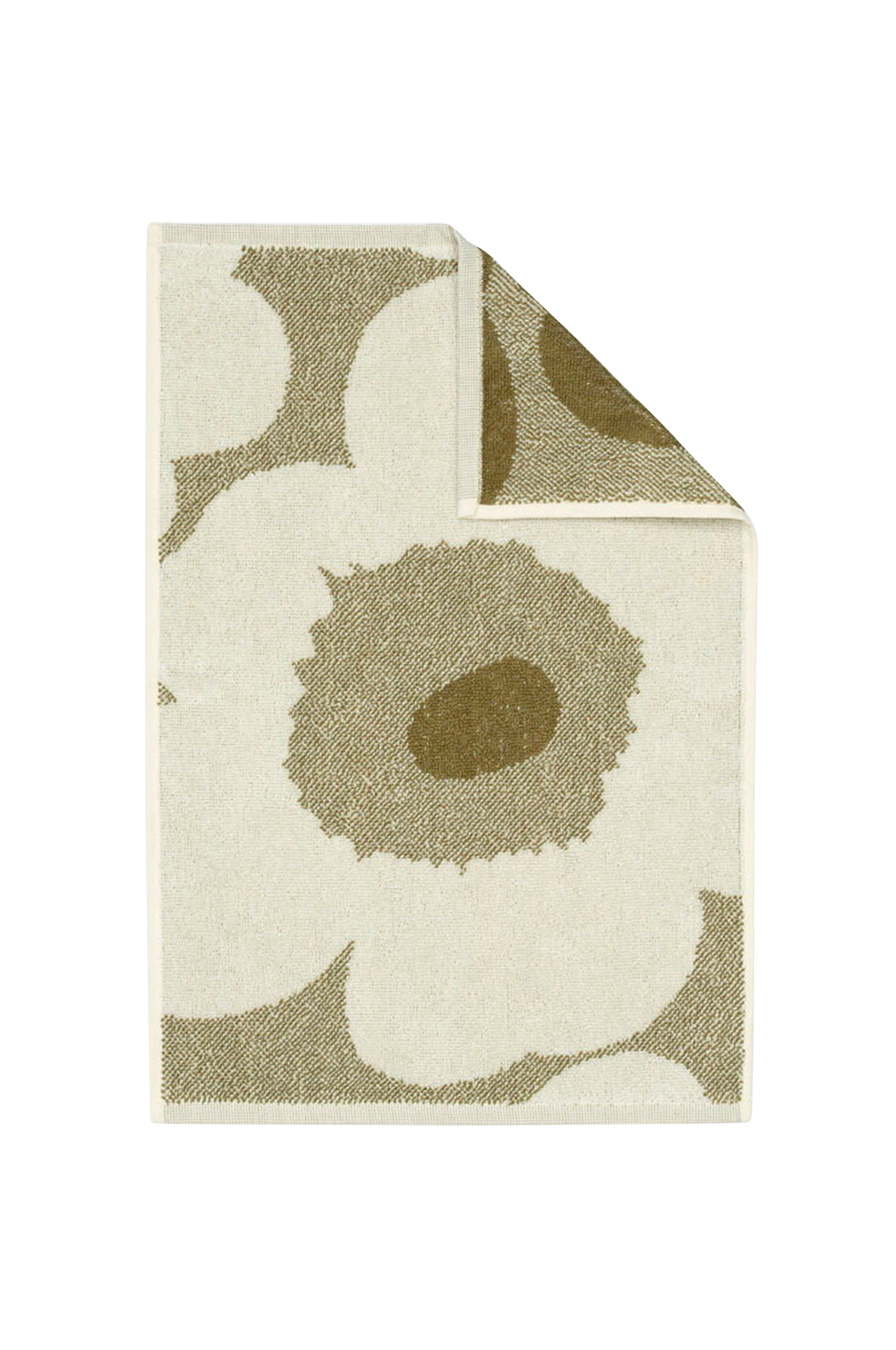 Gästhandduken med mönstret Unikko är tillverkad av ekologisk bomullsfrotté. Unikko Marimekko, som symboliserar kreativitet, föddes i en tid då nästan inga blommönster ingick i Marimekkos kollektioner. Maija Isola var dock fascinerad av temat blommor och bestämde sig för att skapa en hel serie med nya blommönster.