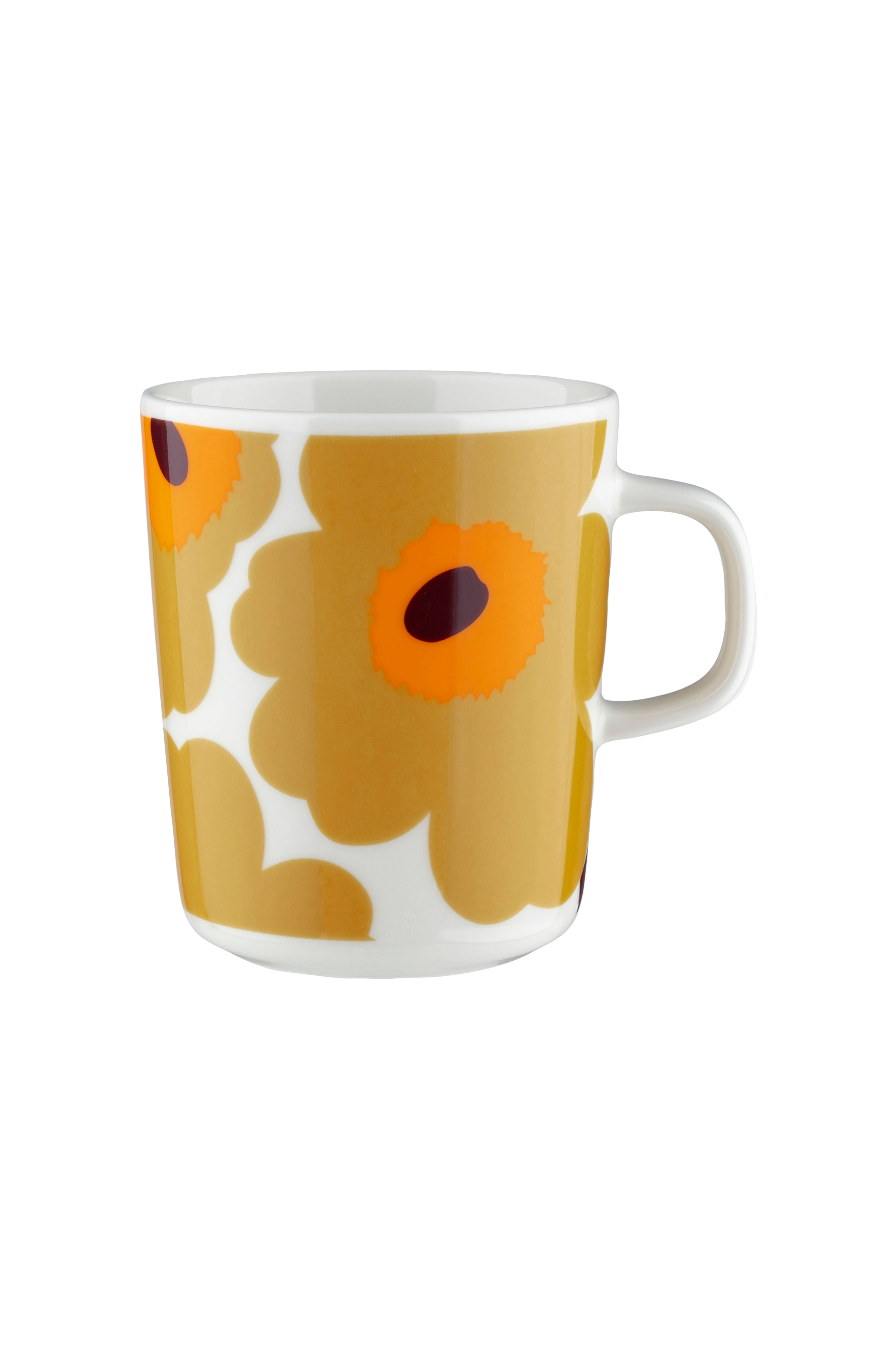 Denna Oiva-mugg är dekorerad med mönstret Unikko. Muggen är tillverkad av vitt stengods. Oiva-produkterna är designade av Sami Ruotsalainen.
