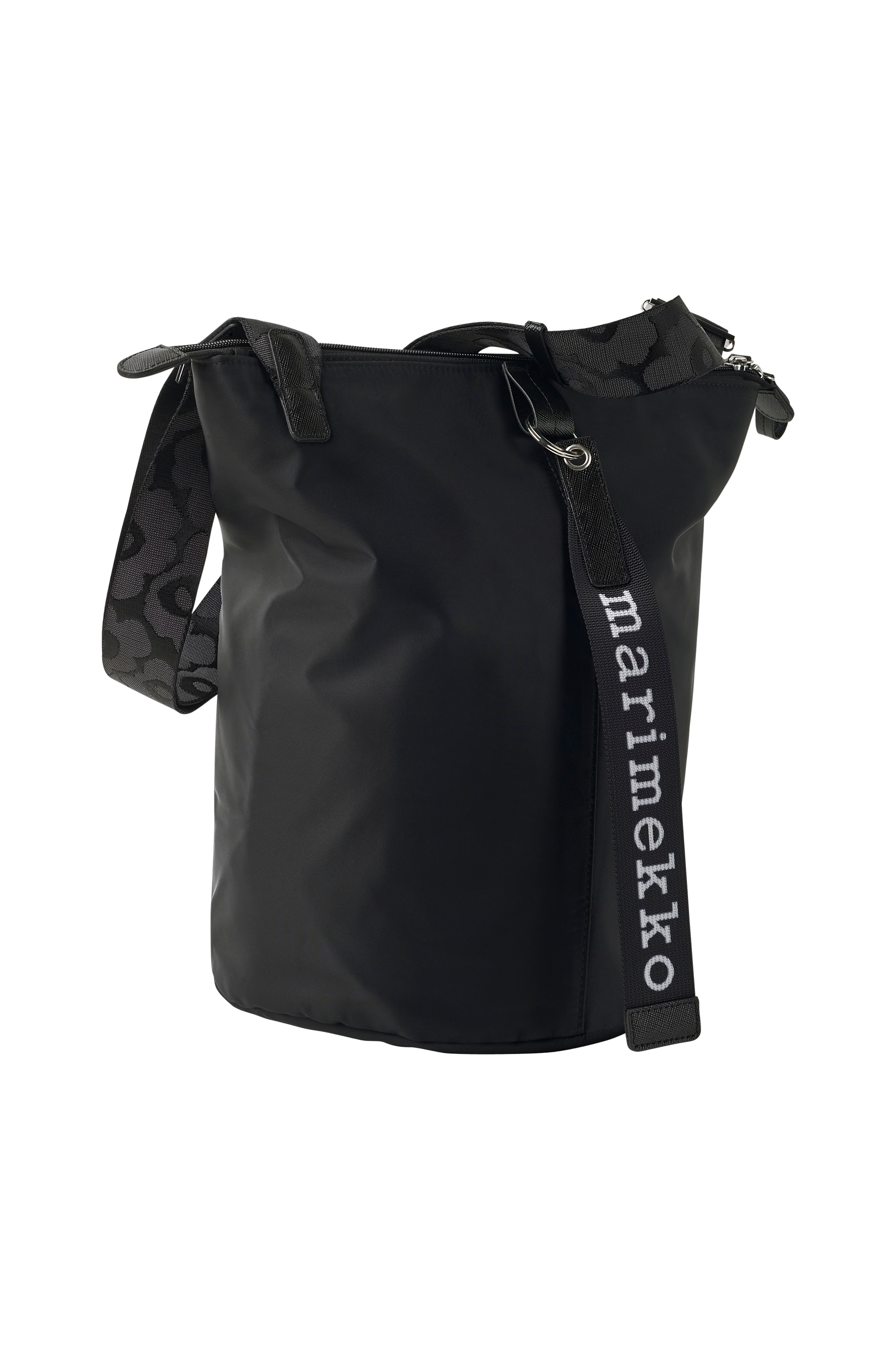 All Day Bucket axelremsväska har tre fack: ett med blixtlås, ett vanligt öppet fack och ett öppet fack med en innerficka. Den justerbara axelremmen har det jacquardstickade Unikko-mönstret. På framsidan finns Marimekko-nyckelringen och på baksidan finns en slip-in-ficka som stängs med en magnetisk knapp. 23,5x34x23,5
