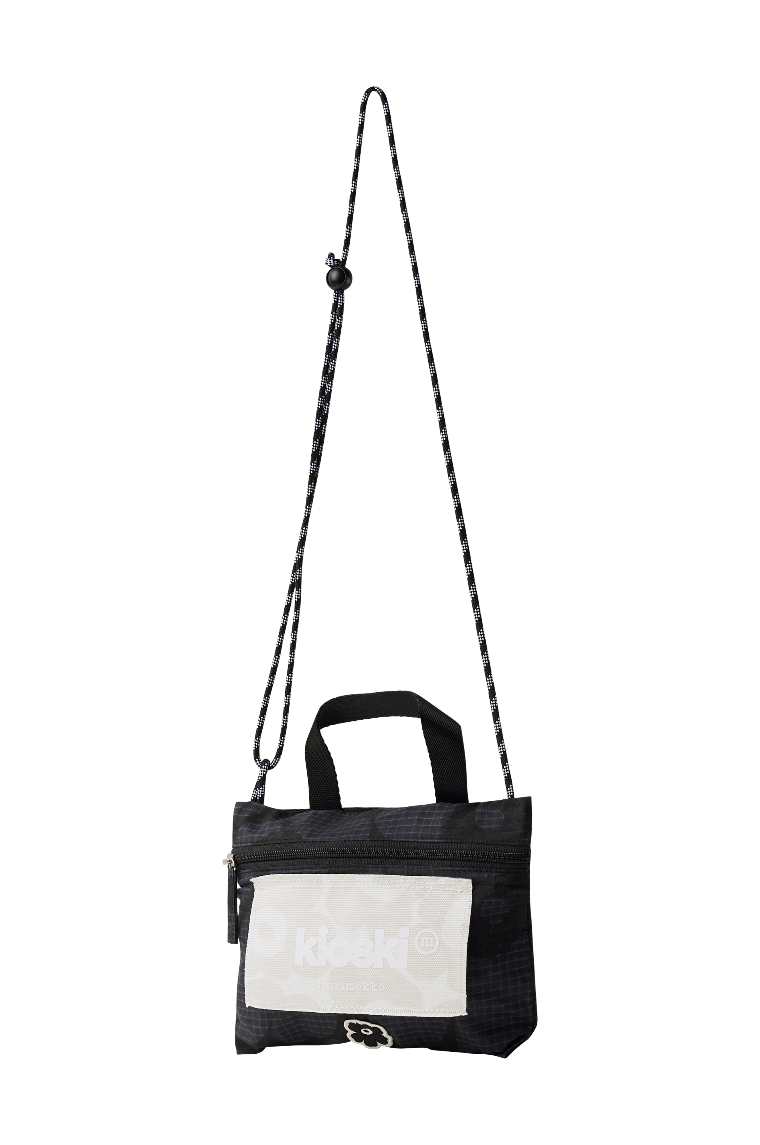 En liten, lätt väska i vävd kvalitet. Ett bärhandtag och en smal, justerbar axelrem. Stängning med dragkedja. Det råkantade Unikko-mönsterstycket framtill är tillverkat av återvunnen bomullscanvas. Bitar skärs av med hela tygets bredd, och därför kan deras utseende variera något. Varje föremål är unikt. Huvudmaterialet i denna produkt är tillverkat av 100 % återvunnen polyester. Stl 19x24 cm.