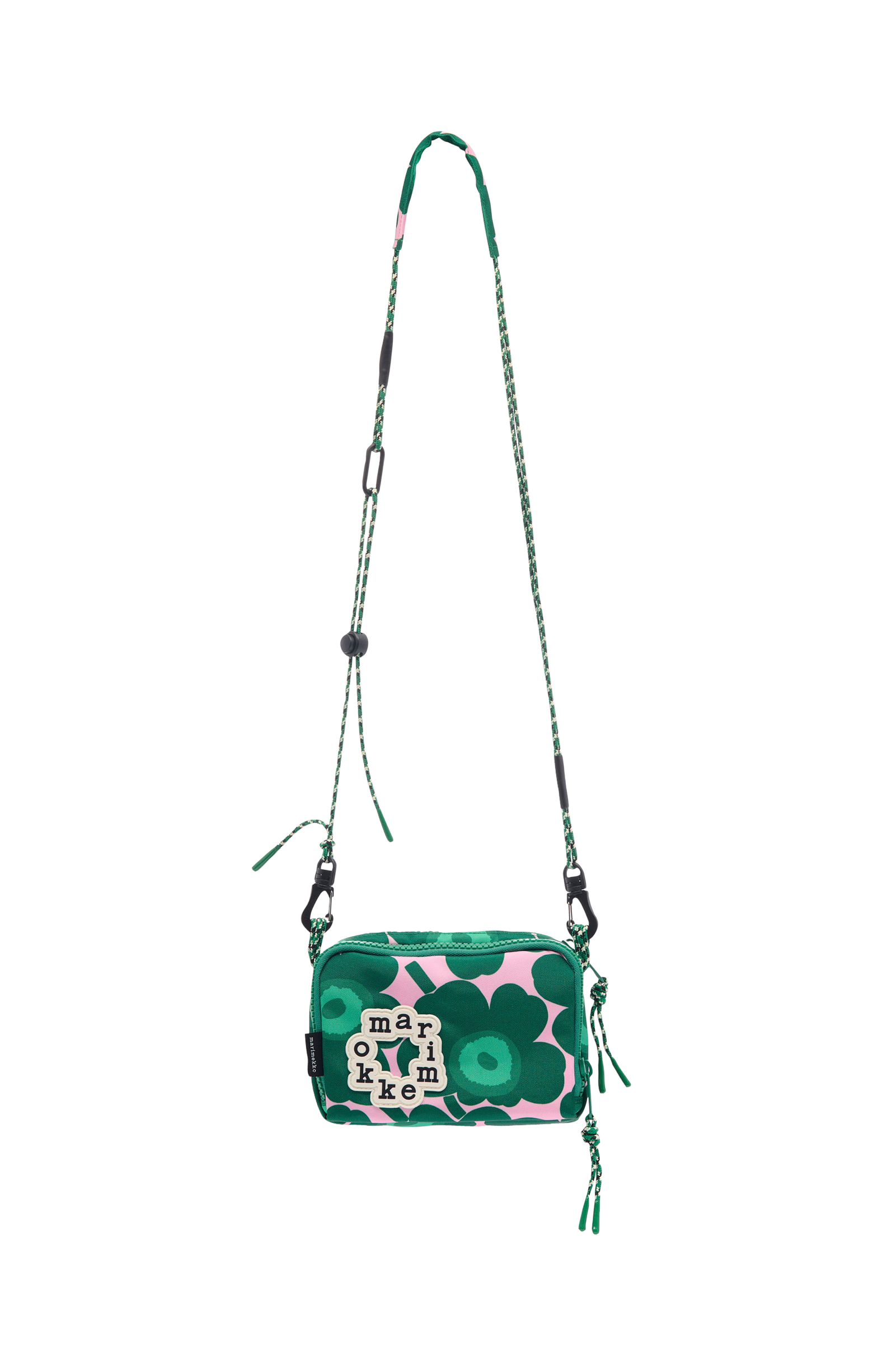 Axelremsväskan Iloisa har mönstret Mini Unikko . Väskan har två olika fack, båda med blixtlåsöppning och dragsko. Det främre facket har en nätficka på insidan. Väskan har en axelrem med snörning och en tunn pad på axelpartiet för ökad komfort. Axelremmen är avtagbar och kan justeras med ett stopp. På framsidan finns en rund Marimekko-logotyp fastsydd.