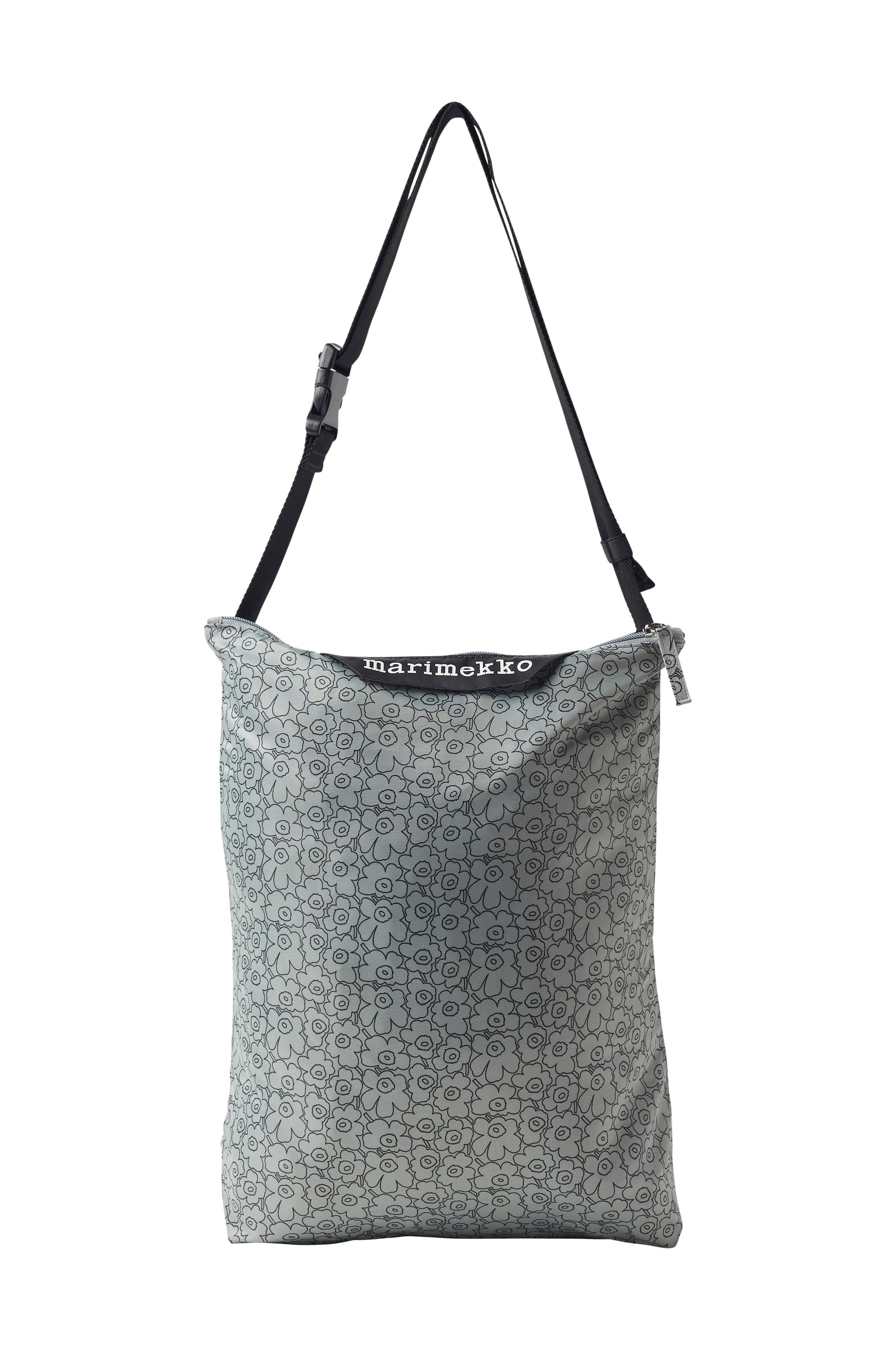 Neat Crossbody Medium axelremsväska i mönstret Piirto Unikko . Väskan har en justerbar axelrem. Väskan har dragkedja, Marimekko-märke på framsidan och en ficka på insidan där hela väskan kan vikas ihop för enkel förvaring.