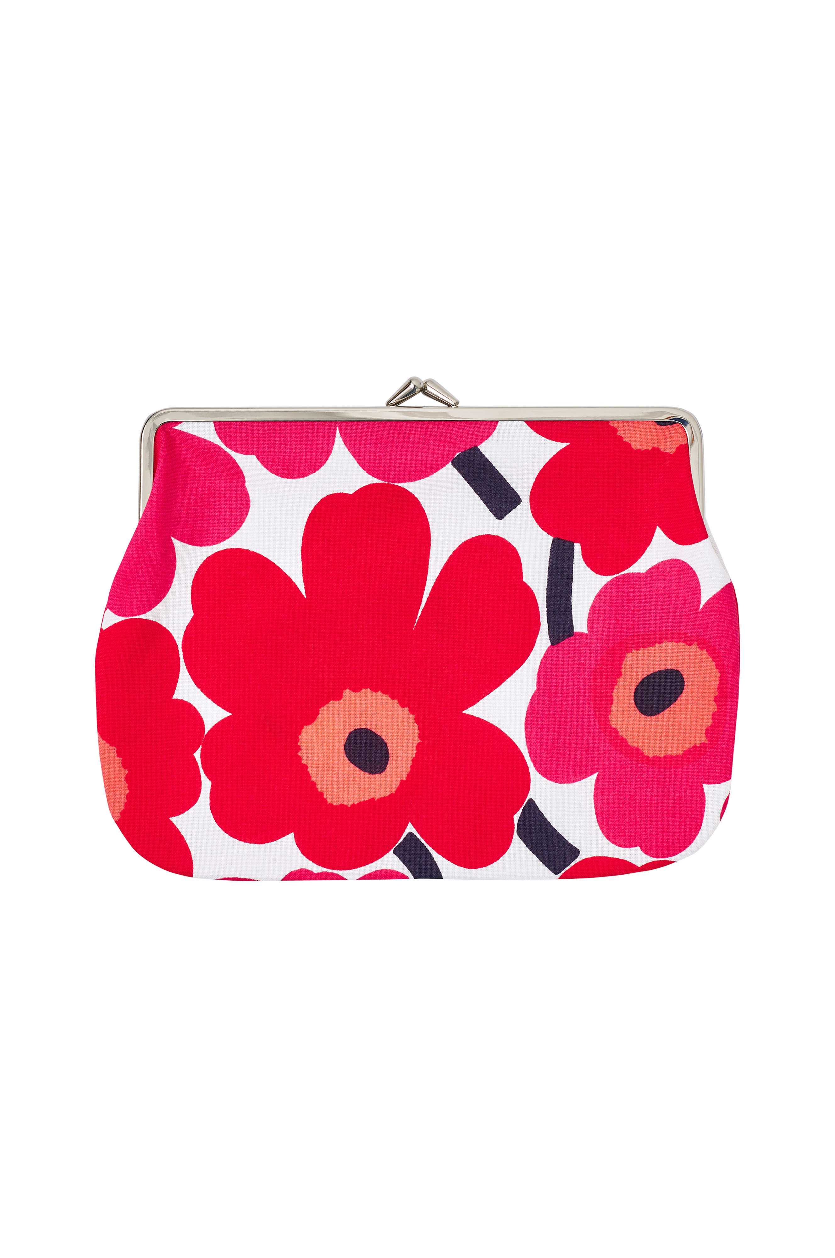 Puolikas Kukkaro är en klassisk väska med många användningsområden. Den här väskan är perfekt för dina dagliga nödvändigheter och mycket mer. Den har en metallram som är lätt att knäppa upp och stänga. Det svartvita Mini Unikko-mönstret är tryckt i Helsingfors.
