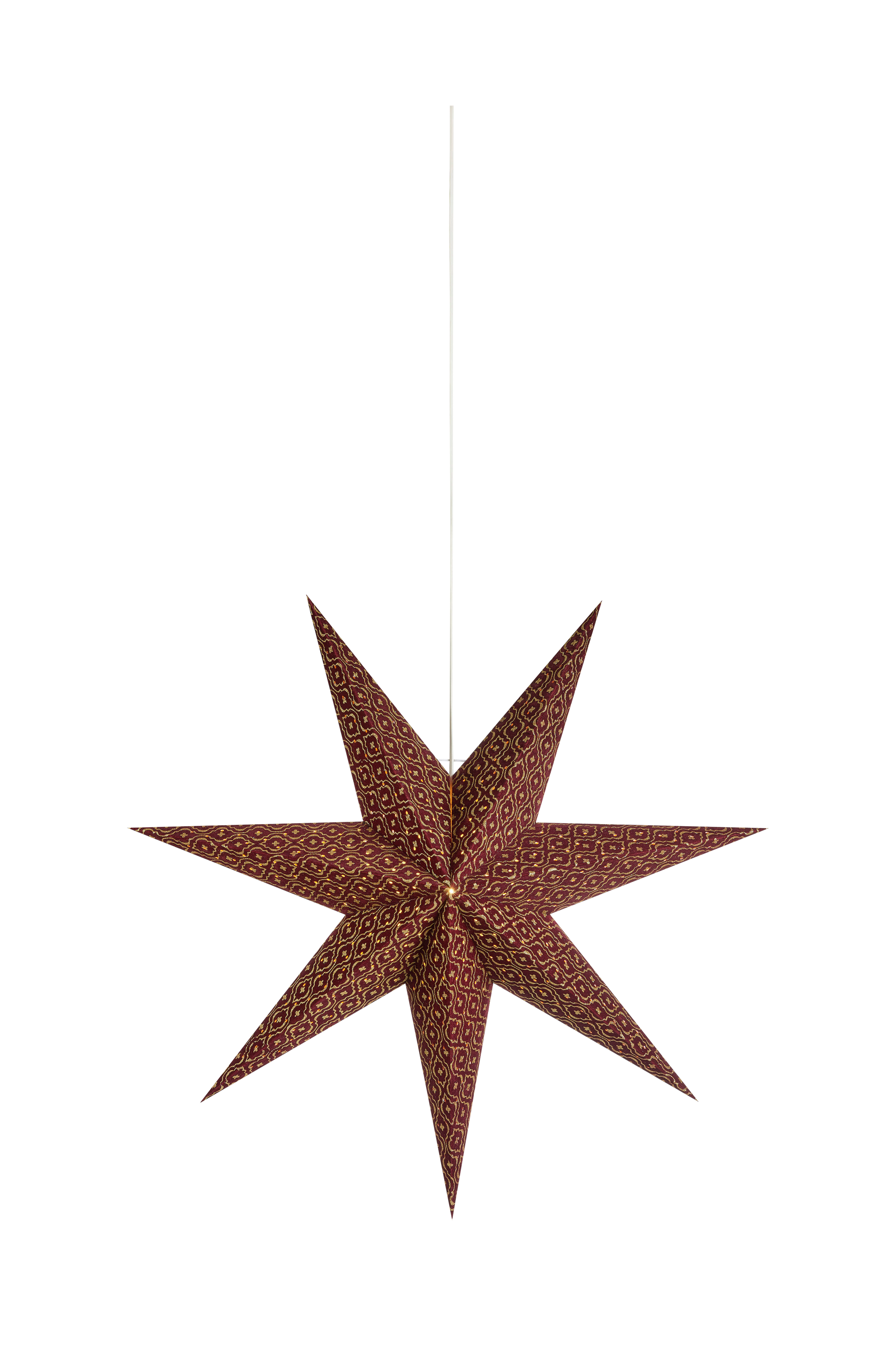Hängande stjärna med mönstrad skärm. Stjärnans diameter 75 cm och djup 19 cm. 3,5 meter kabel med brytare på sladden. Max 1x25W. E14-sockel. Ljuskälla ingår ej.