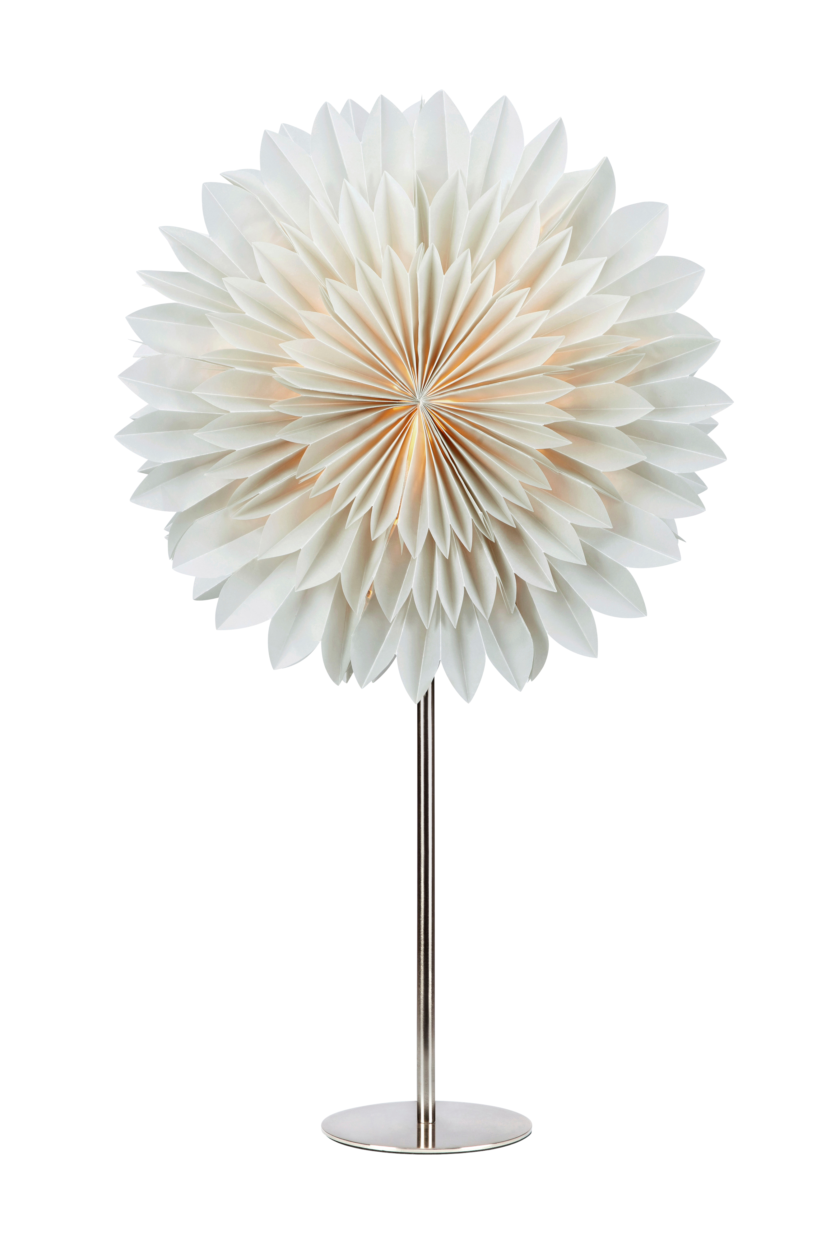 Solina papperstjärna med fot i stål. 2 meter kabel i plast, med strömbrytare på sladden och stickkontakt. 1 Liten sockel (E14) om max 6W eller motsvarande i LED. Ljuskälla ingår ej.