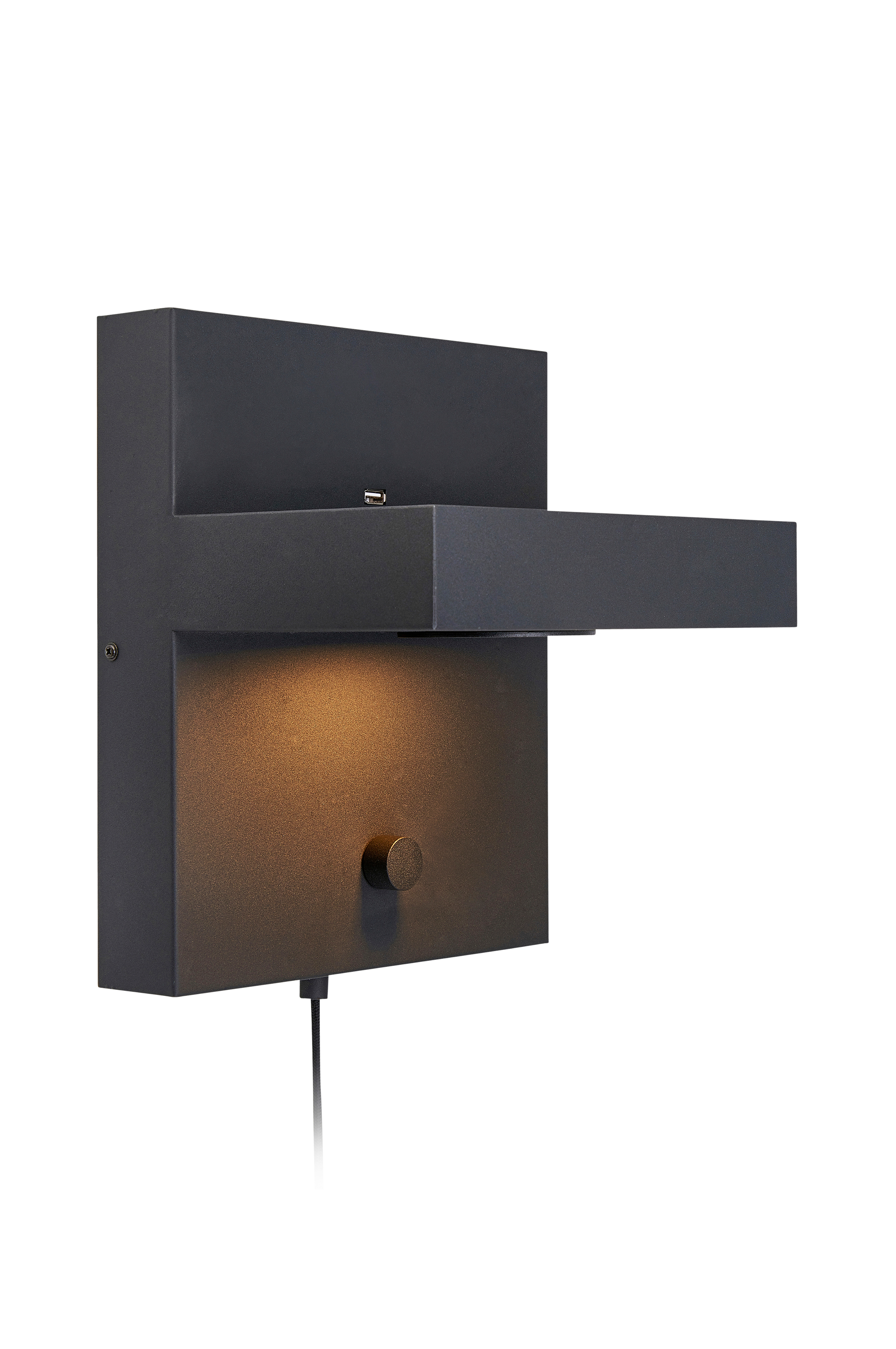 Kubik vägglampa från Markslöjd. Mattsvart metall. Steglös dimmer / strömbrytare.USB uttag för laddning av exempelvis telefon/ läsplatta/kamera. 2m svart textilkabel. Fast LED ljuskälla. 525 Lumen. 120 graders spridningsvinkel.