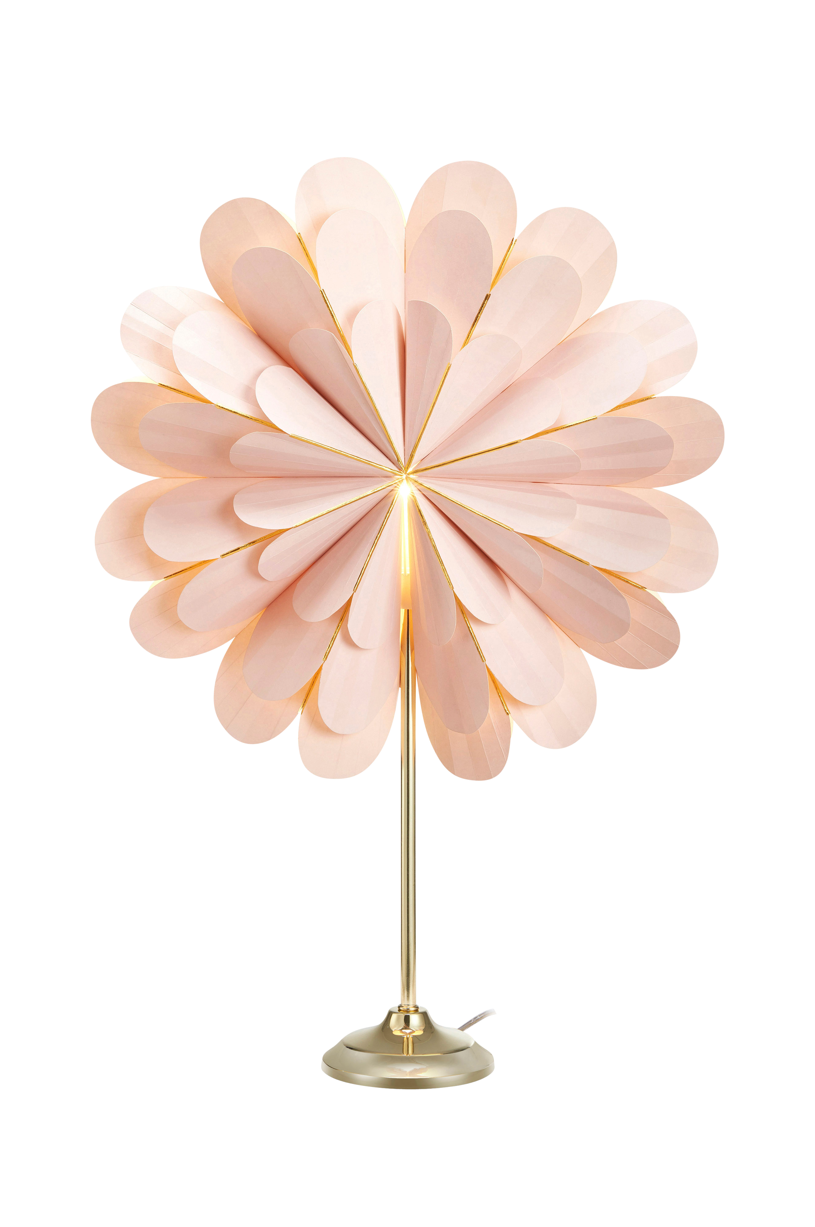 Bordslampa med fot i mässing. Pappskärm i blomform. Diameter på 45 cm och den totala höjden, inklusive fot, på 65 cm. Lampan kräver en glödlampa med liten sockel (E14) om max 25W eller motsvarande i LED, ingår ej. 2 meter lång sladd med strömbrytare.