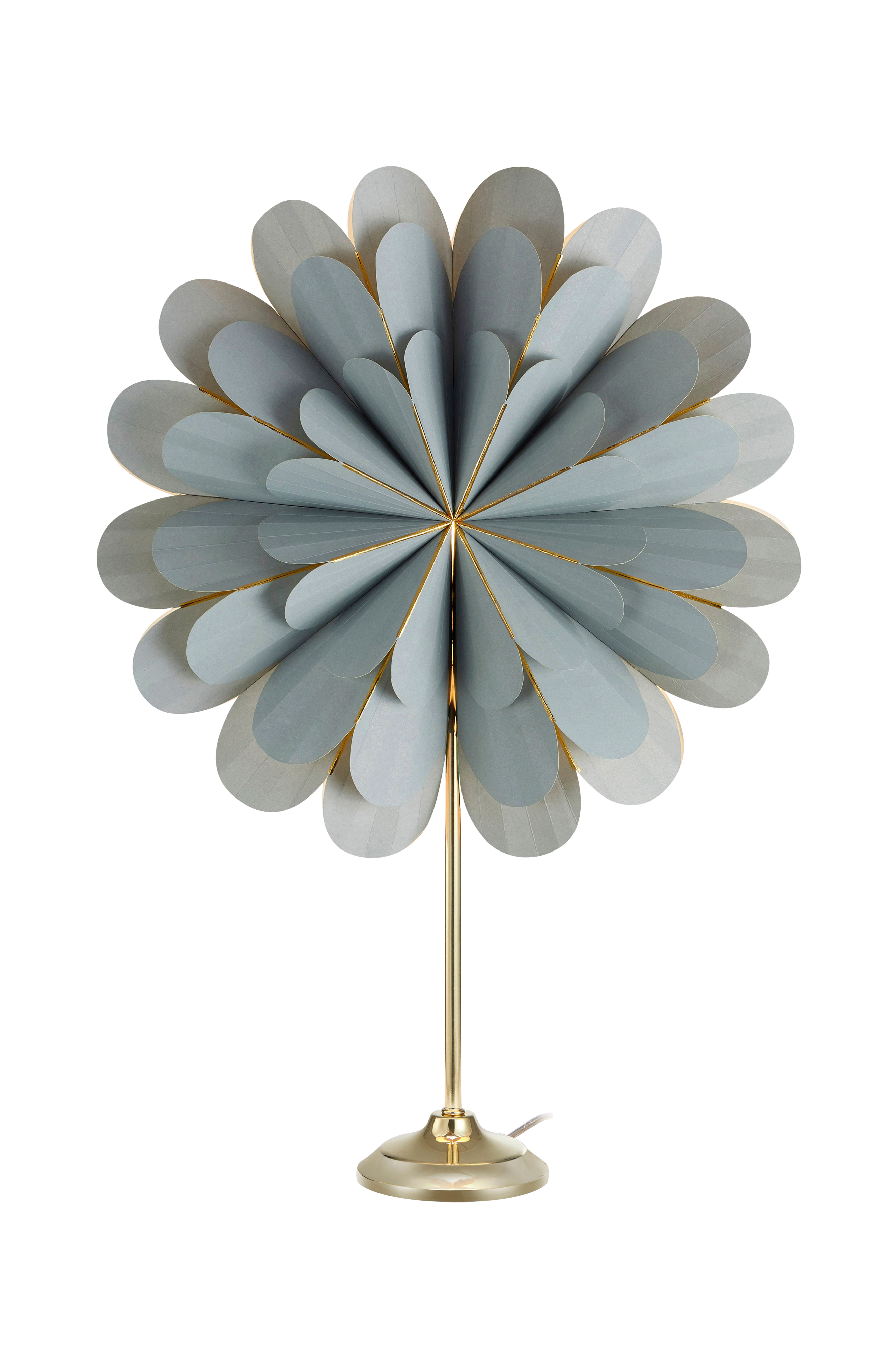 Bordslampa med fot i mässing. Pappskärm i blomform. Diameter på 45 cm och den totala höjden, inklusive fot, på 65 cm. Lampan kräver en glödlampa med liten sockel (E14) om max 25W eller motsvarande i LED, ingår ej. 2 meter lång sladd med strömbrytare.