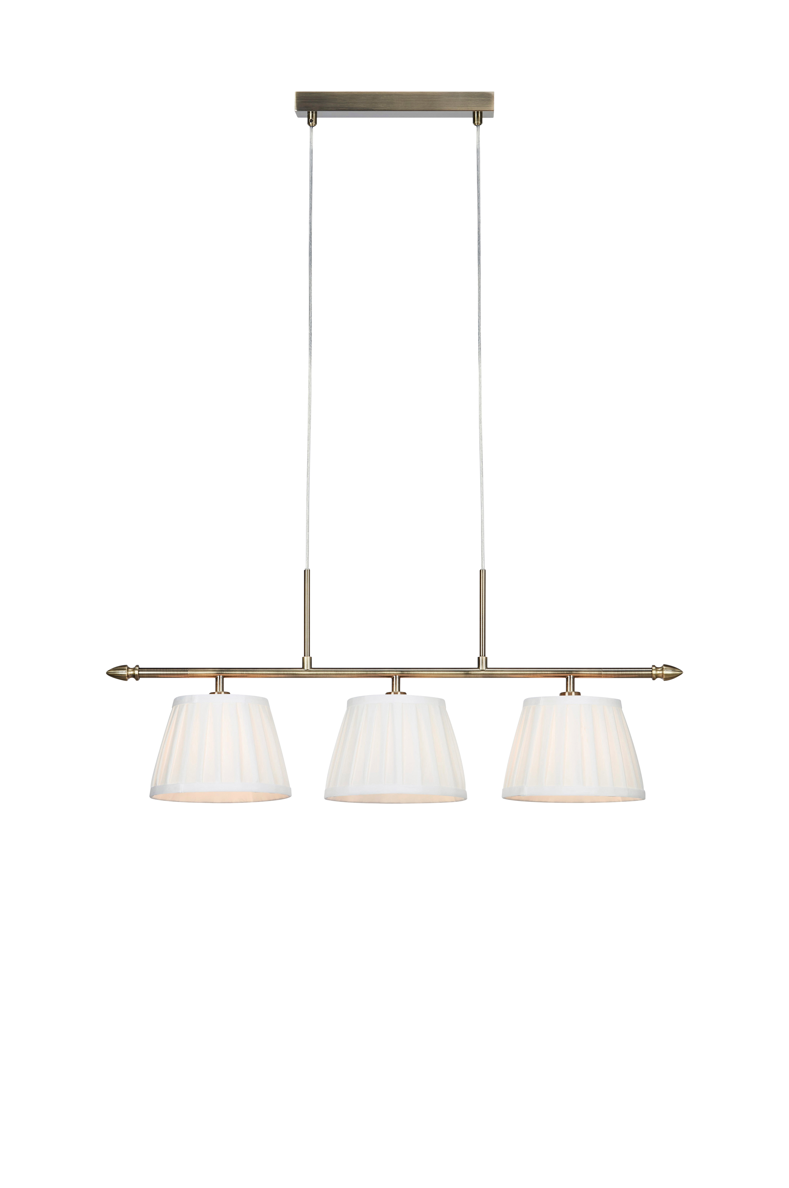 Oxford pendel från markslöjd. 3st textilskärmar med metalldetaljer. 1,5m pvc-kabel. Monteras med konsol. 3xe14, max 40w. Klass i. Ljuskällor ingår ej.