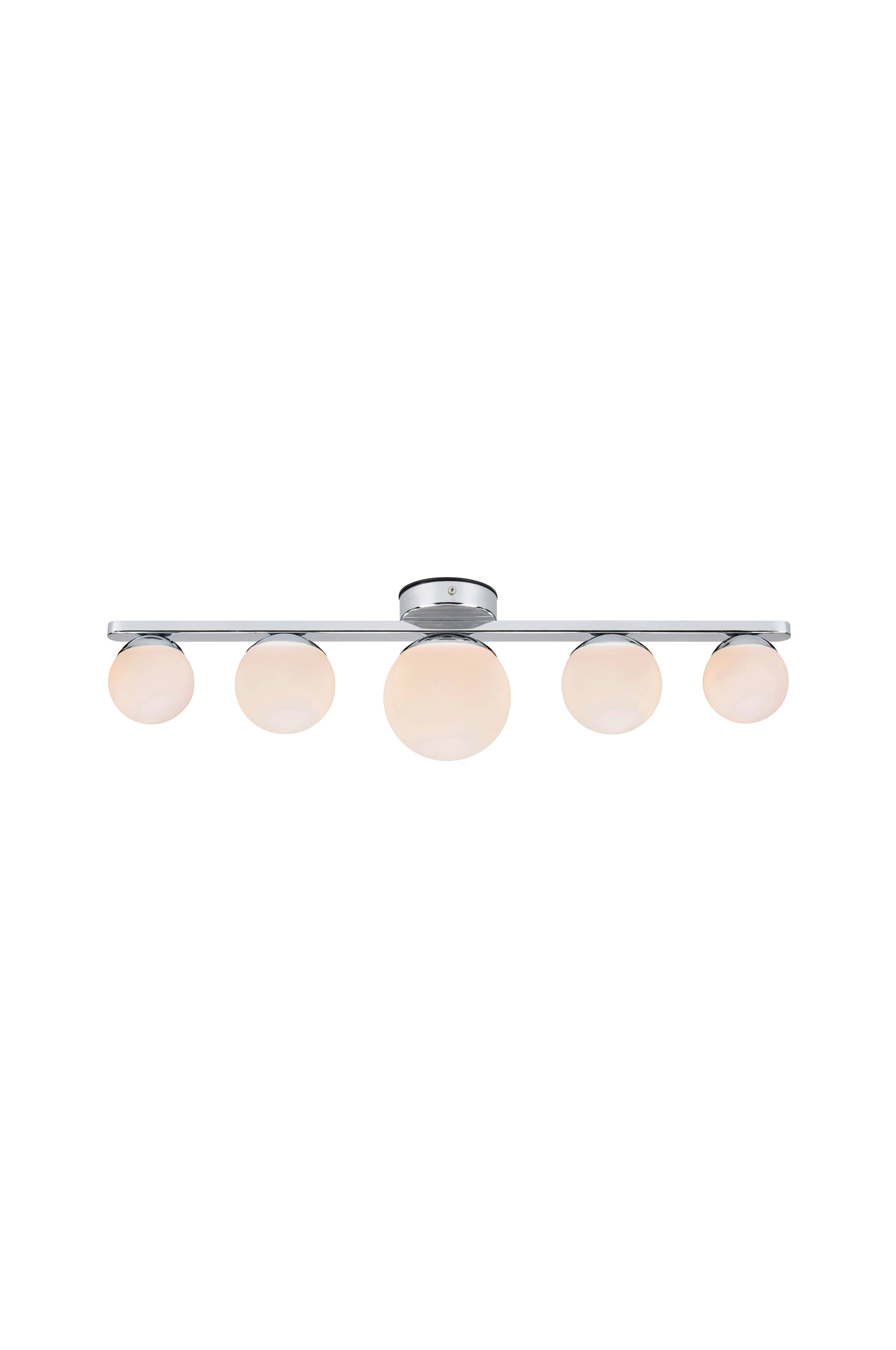 Stilren taklampa för badrum, i metall och opalfärgade glas. Puro har 5 st lamphållare, sockel G9. Använd max 20 watt eller motsvarande i LED. Takkontakt och ljuskällor medföljer ej. Finns att köpa separat. Lampan är jordad. Godkänd för badrum, IP44.