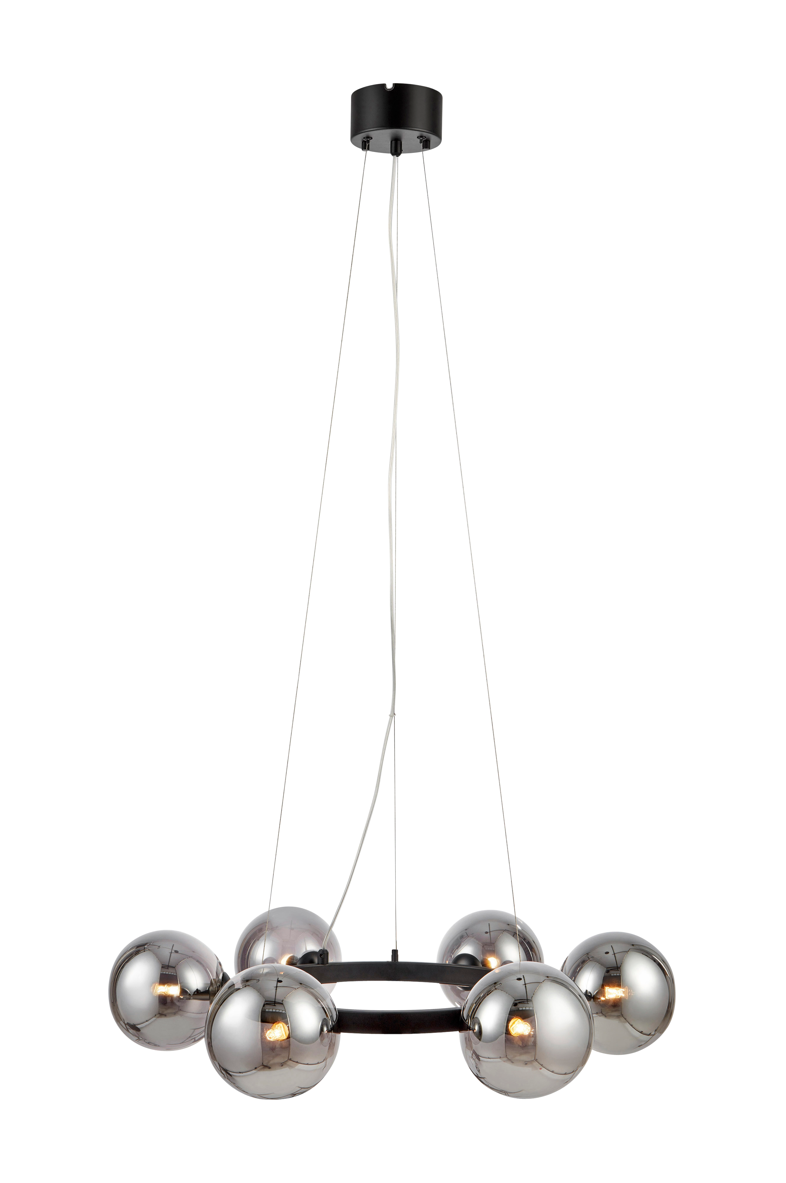 Circle takpendel från Markslöjd. Taklampan Circle är tillverkad i metall och rökfärgade glasglober. På metallstommen sitter sex stycken rökiga glasskärmar. Diameter på pendel är totalt 71 cm inklusive lampkuporna och höjd totalt 164 cm inklusive lampkupor och takkopp. Lampkupornas storlek är 15 cm i diameter och takkoppens storlek är 12 cm i diameter och 6 cm hög. Krokupphäng. Max 6x20W. G9 Sockel. Ljuskällor medföljer ej. Takkontakt medföljer ej. Finns att köpa separat. Jordad.