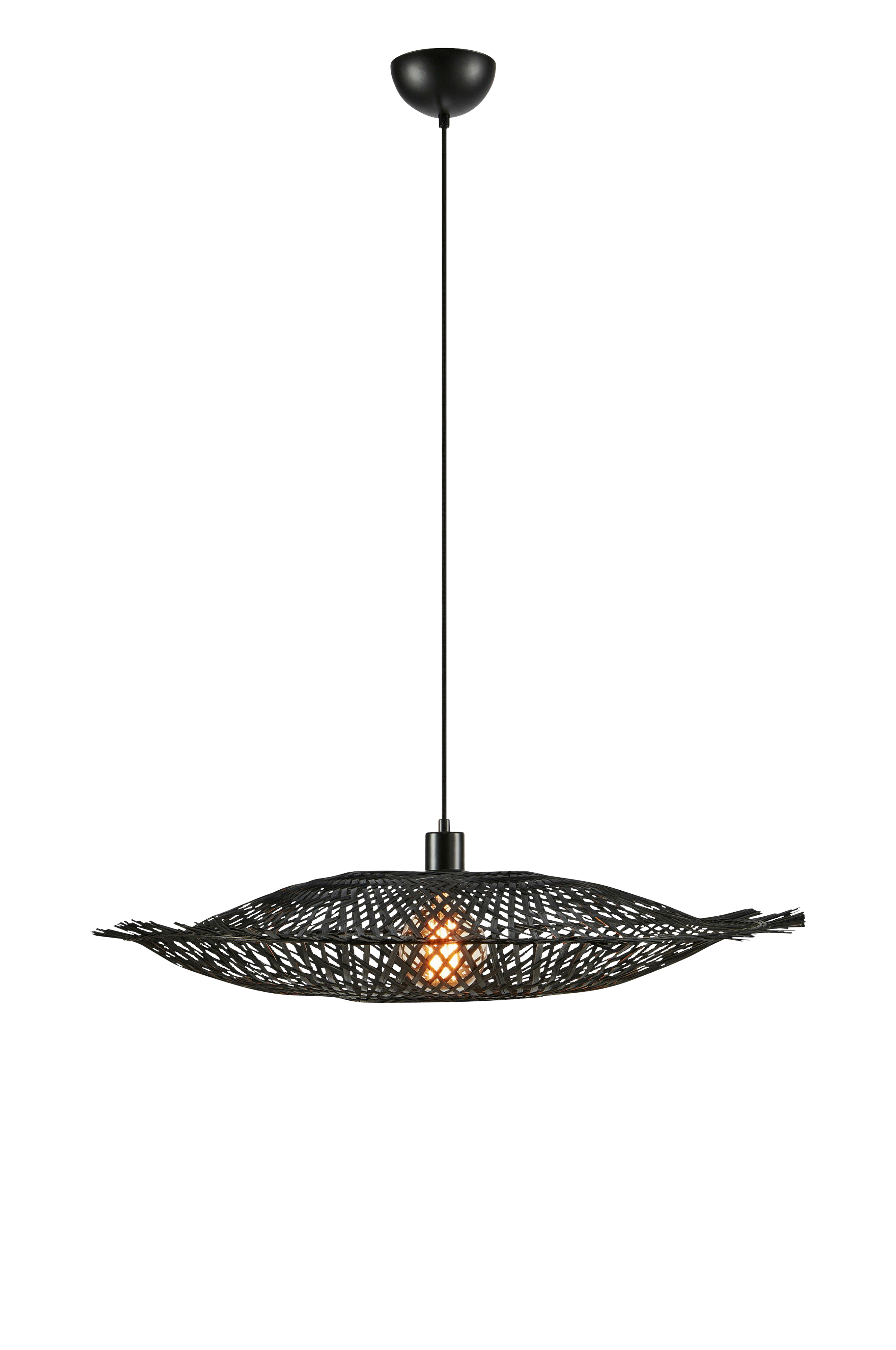Kumo pendel från markslöjd. Bas i metall och skärm i bambu. Diameter 75 cm. 1,5 m textilkabel. Krokupphäng. Klass1 - jordad. Direktkoppling, takkontakt medföljer ej. 1xE27, max 40w. Ljuskälla ingår ej.