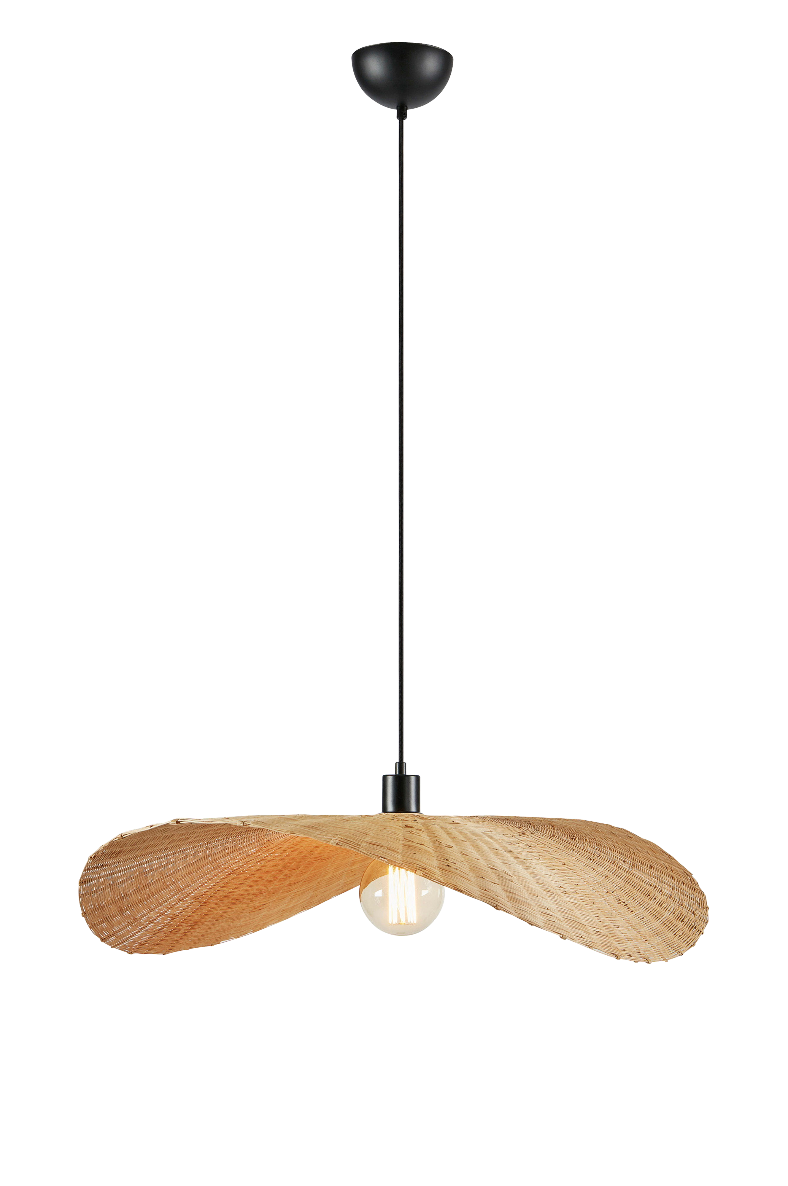 Rayo pendel från markslöjd. Bas i metall och skärm i bambu. Diameter 70 cm. 1,5 m textilkabel. Krokupphäng. Klass1 - jordad. Direktkoppling, takkontakt medföljer ej. 1xE27, max 40w. Ljuskälla ingår ej.