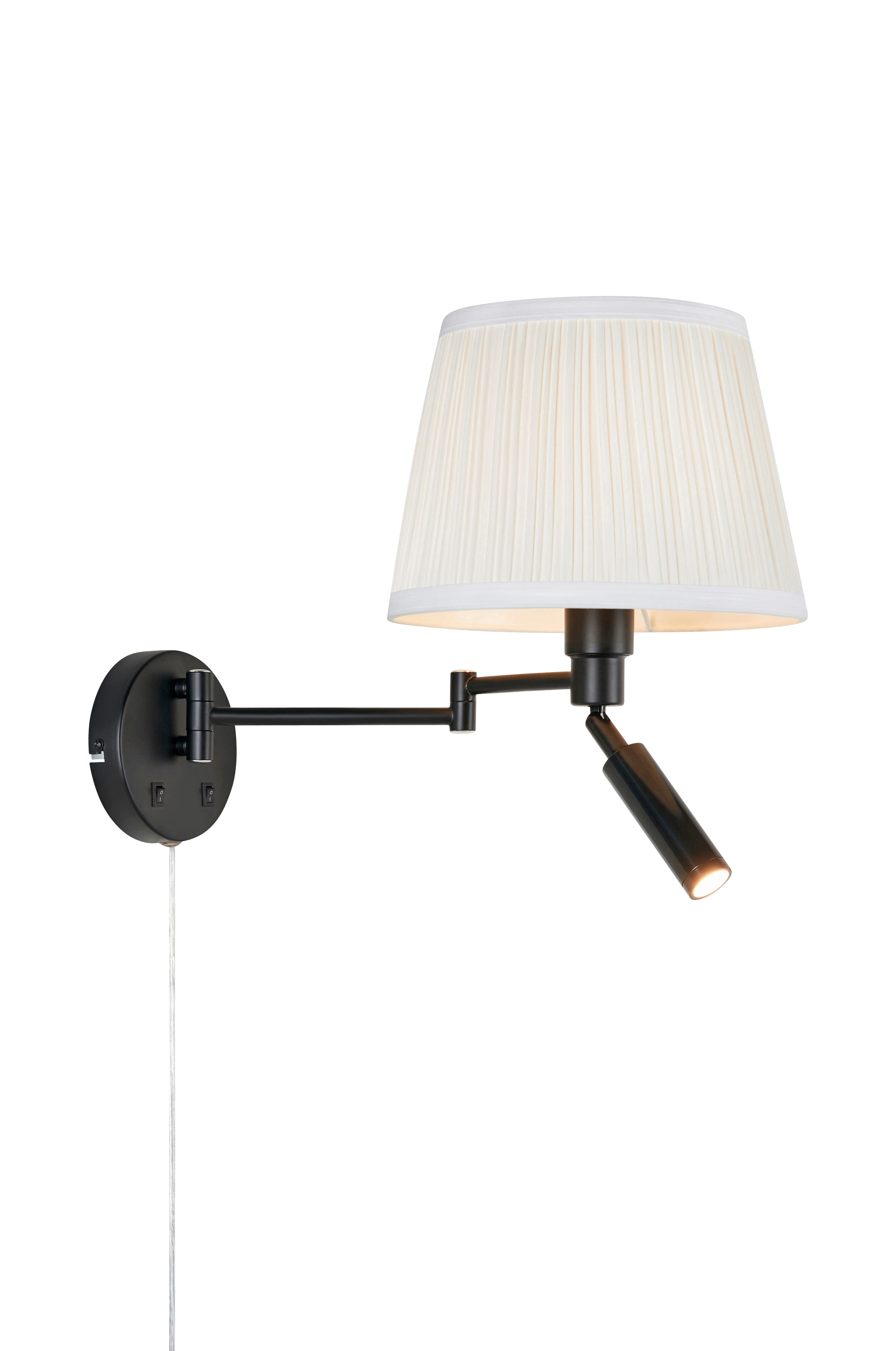 Pivot vägglampa från markslöjd. Vägglampa i metall med två armar - en svängarm med textilskärm och justerbar led-läslampa för riktad belysning. Textilskärmen har en diameter på 25cm och ger ett behagligt sken. Monteras med konsol. Integrerad kopplingsdosa i väggplattan möjliggör enkel anslutning till fast elinstallation. Klass ii. 1xe27+led, max 40w, 4w. E27-ljuskälla ingår ej.