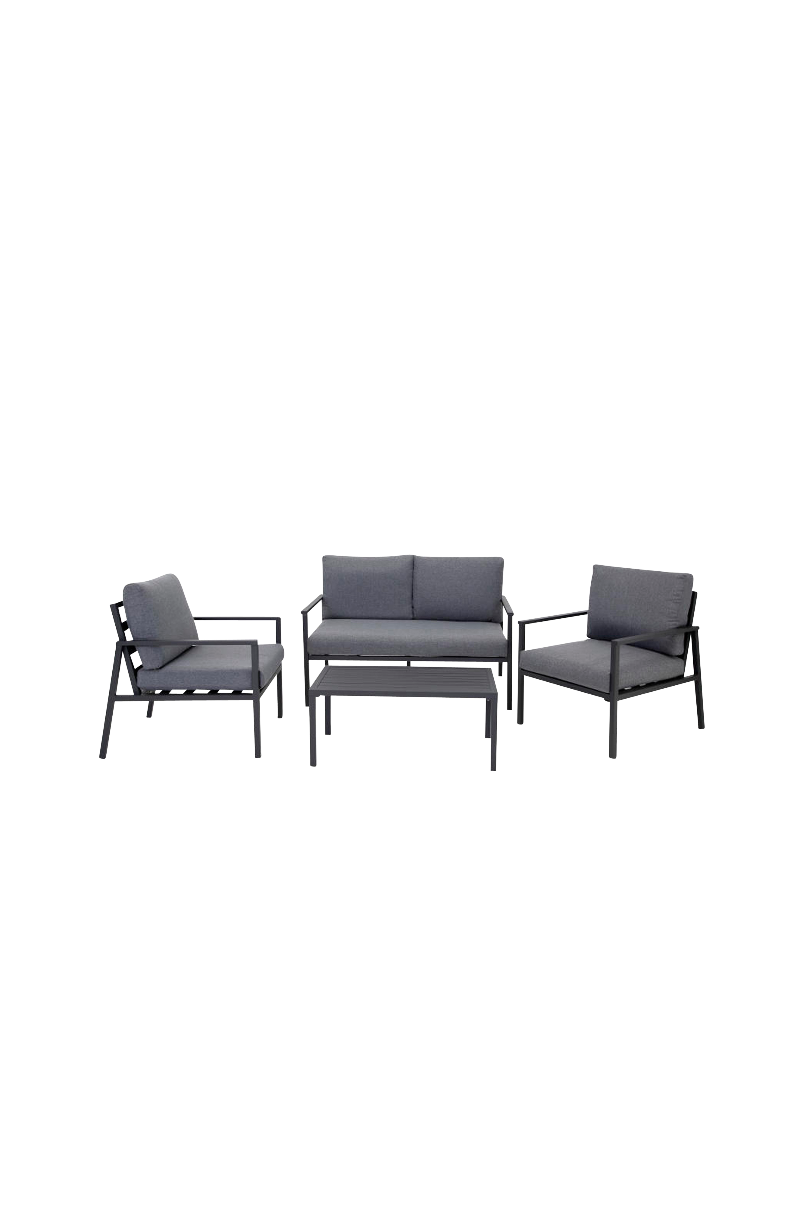 Soffgrupp med en 2-sits, två fåtöljer och ett bord med en antracit pulverlackerad aluminiumram. Bordskivan i aluminium. Grå polyester kuddar. Soffgruppen levereras omonterad.