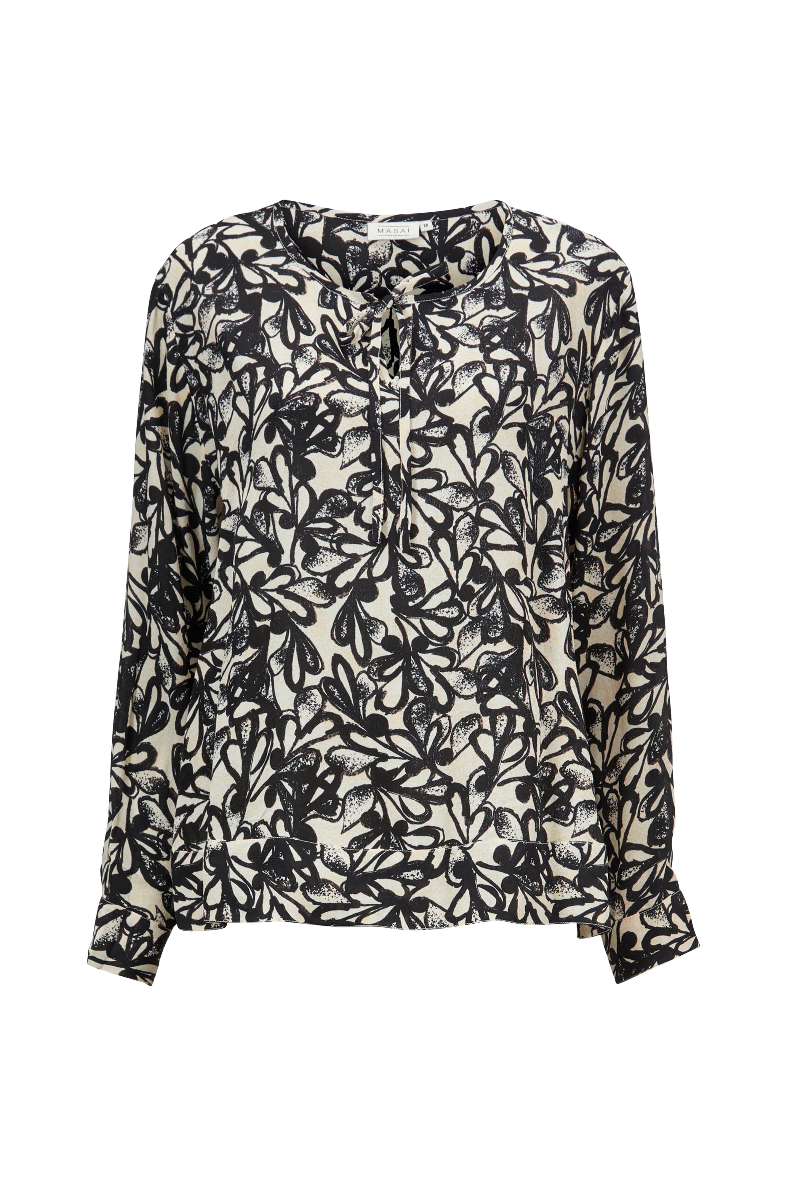 Blus i lätt a-linjeform med sprund och knyt framtill i halsringningen. Långa ärmar med manschett. Gjord i vävd viskos.