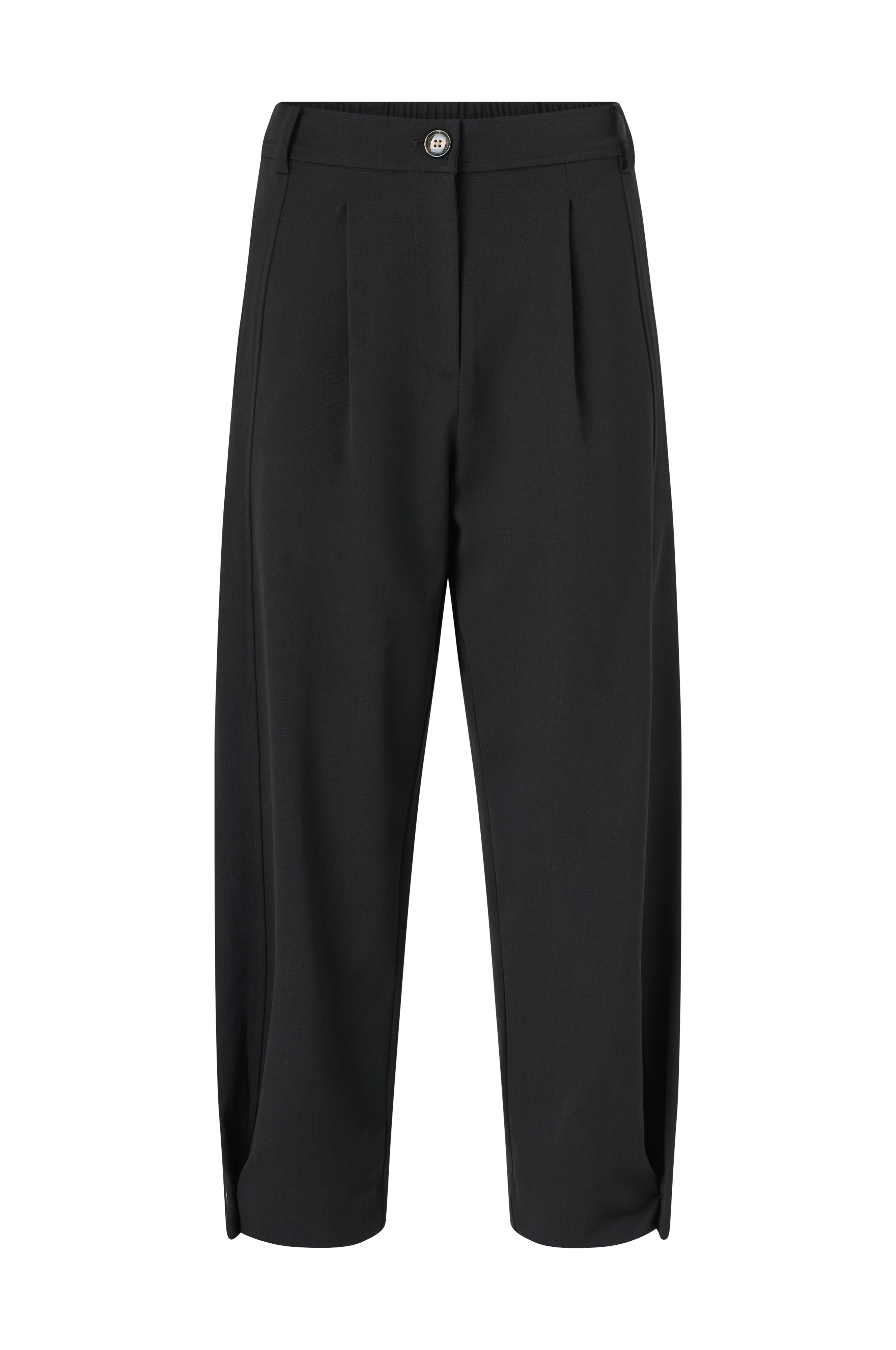 • Högmidjade byxor med caprilängd• Dragkedjegylf• Passpoalfickor i sidorna• Slät linning fram i midjan med resår bak• Veckade detaljer fram i midjan• Fuskfickor bak• Dekorativ knapp i bensluten• Beninnerlängd: 65 cm i storlek S